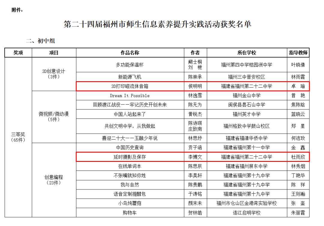 学校为贯彻《关于进一步减轻义务教育阶段学生作业负担和校外培训负担的意见》精神,组织学生积极参加福州市教育局组织、福州市电化教育馆具体承办的第二十四届福州市师生信息素养提升实践活动,学校将活动开展与“提升课后服务水平,满足学生多样化需求”结合起来,为....…