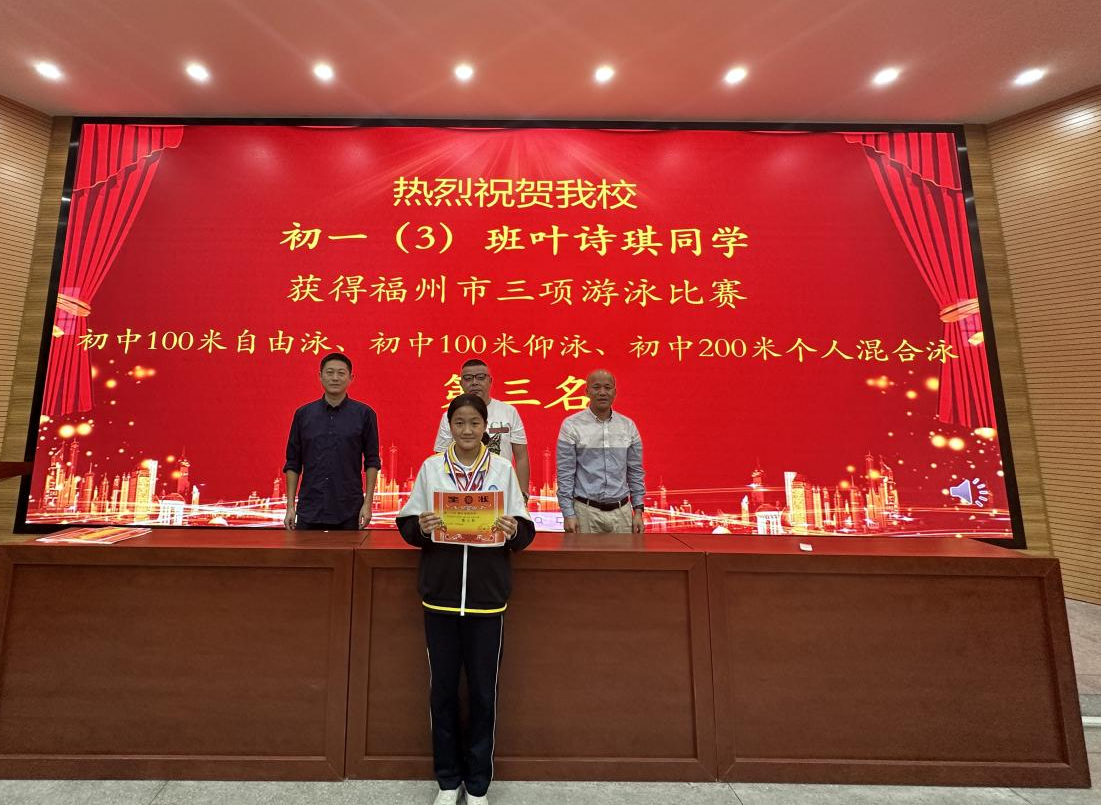 金秋展风采,运动绽芳华。2023年10月21-22日福州市第60届中小学生运动会游泳比赛在福州第三中学滨海校区精彩开赛。在为期两天的激烈角逐中,我校2023级3班叶诗琪同学在初中组100米自由泳、初中组100米仰泳、初中组200米个人混合泳三项赛事中均取得第三名的佳绩。…