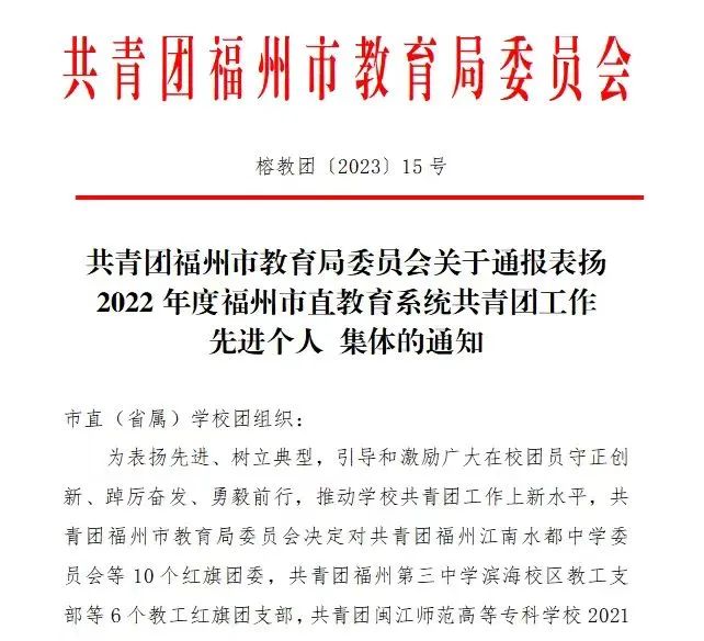 近日,共青团福州市教育局委员会关于通报表扬2022年度福州市直教育系统共青团工作先进个人和集体的通知下发,共青团点点taptap官网委员会荣获福州市直教育系统“五四红旗团委”称号;共青团点点taptap官网教工支部荣获福州市直教育系统“教工五四红旗团 (总) 支部”....…