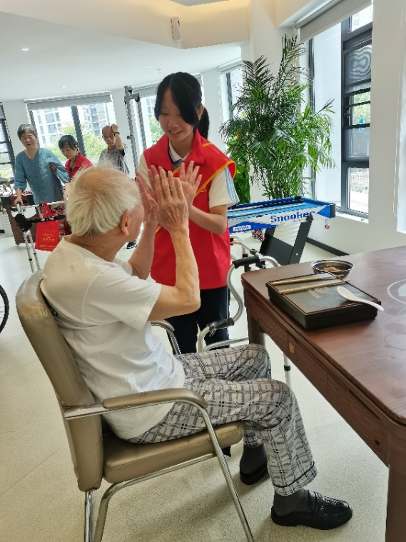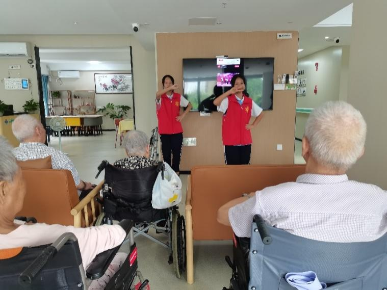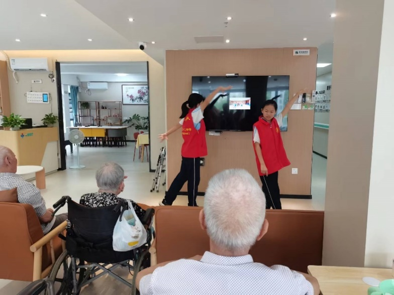 在工作人员的安排下,志愿者们分为两个小组。一组的志愿者们为老人们表演节目,二组的志愿者们陪老人做康复运动、谈心聊天。志愿者们到达养老服务中心后,带队老师再次和学生志愿者们强调了相关注意事项。志愿者们带着真诚灿烂的笑容和最真挚的问候走进养老院,陪爷爷奶奶们下象棋、看电视、聊天。