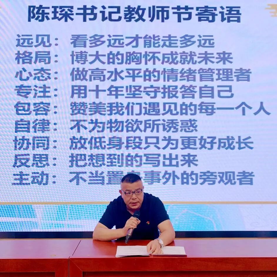 陈琛书记向全体教职工致以节日的问候和祝福,他希望全体教师从“远见、格局、心态、专注、包容、自律、协同、反思、主动”等方面,不断坚定理想信念、厚植爱国情怀、涵养高尚师德,投身教育事业,努力展现二十二中教师为党育人、为国育才的精神风貌。