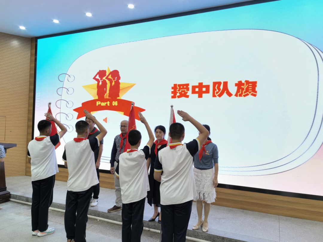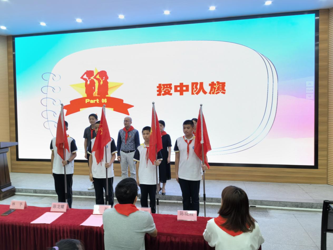 在鲜红的队旗下,校团委书记陈晓霞老师宣读了2023级少先队大队成立决定、大队委旗手名单以及下设中队名单,并向他们表示祝贺。校领导陈龙耀校长、林予副校长、陈磊副校长为新中队授中队旗。中队长们个个精神饱满,庄严地接过神圣的旗帜。鲜艳的旗帜熠熠生辉,引领少先队员们茁壮成长。