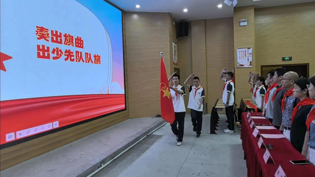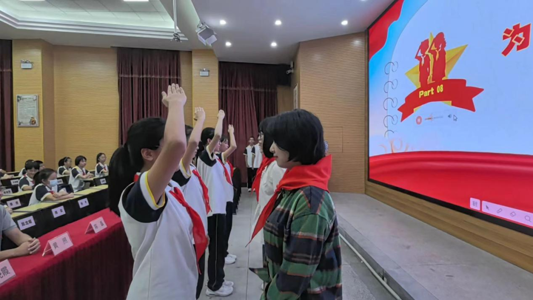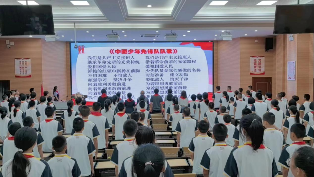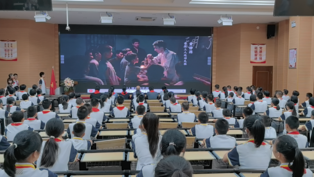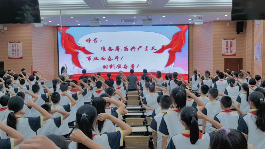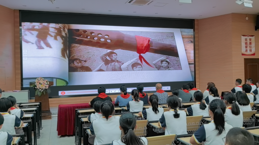 我们的队旗火一样红,星星和火炬指引方向。红领巾心向党,铭记历史,缅怀先烈。会堂中,少先队员们集体观看了短片《致敬红领巾》,聆听了师长讲话,更加坚定了始终听党话、跟党走的信念。