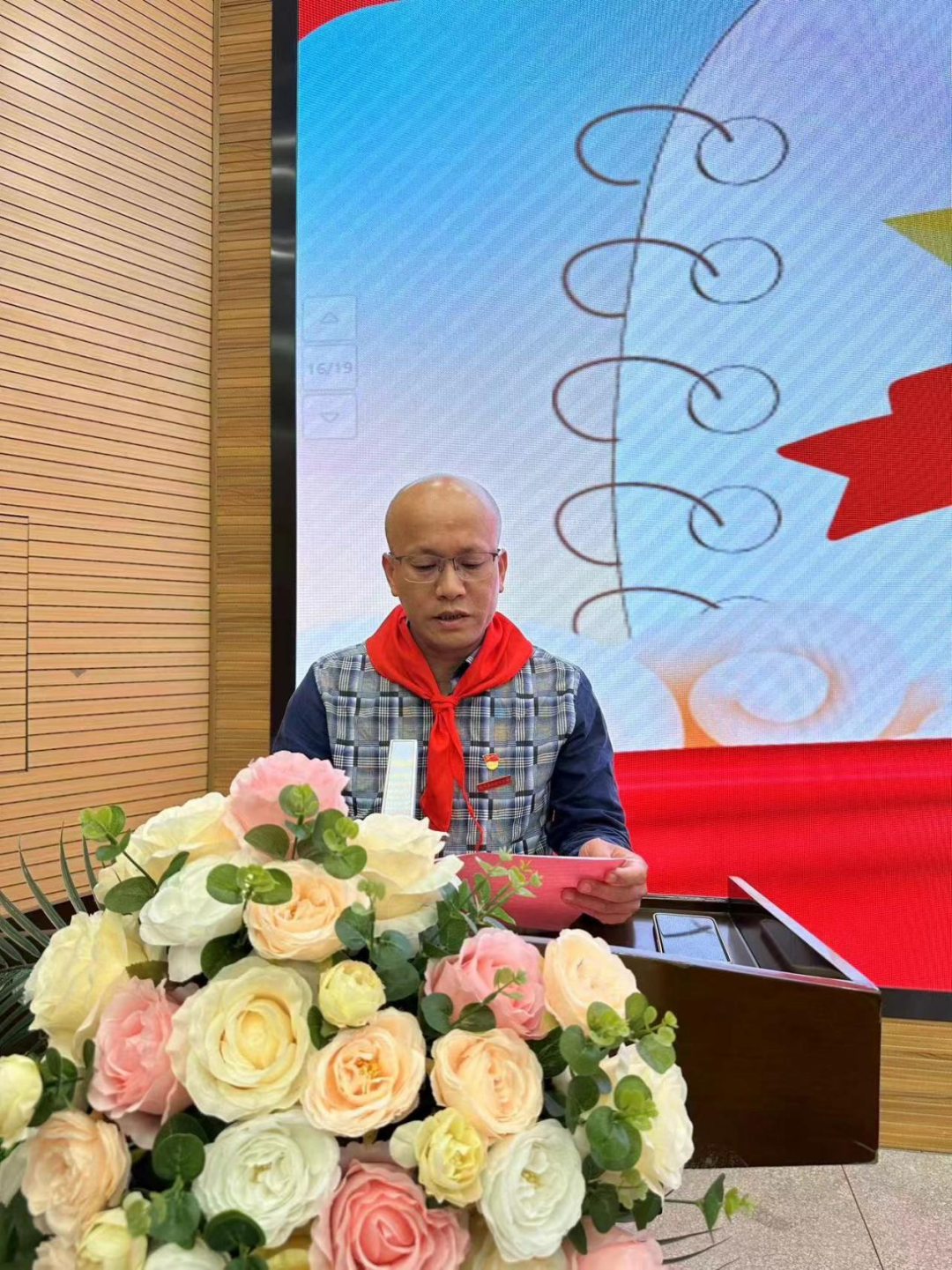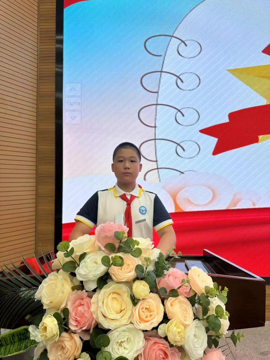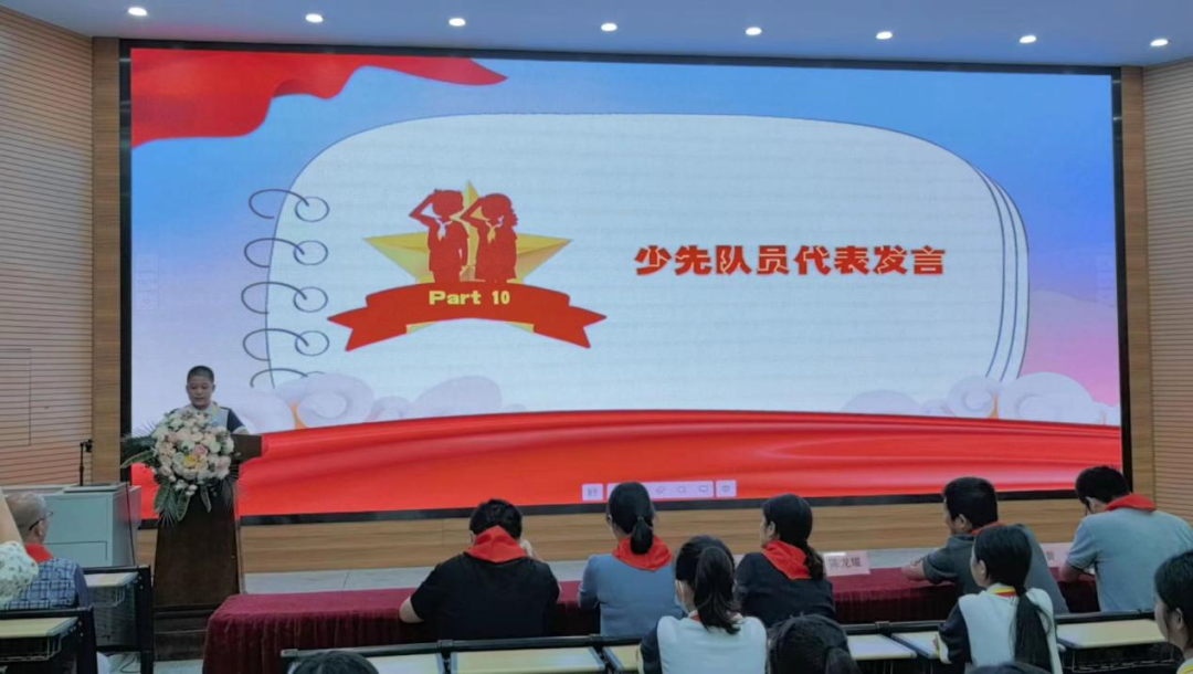七(4)中队孙佑嘉同学作为少先队员代表发言。他表达了刻苦学习科学文化知识,积极参与志愿者服务,努力成为优秀少先队员的决心。他呼吁全体少先队员在人生成长的新阶段,铭记在星星火炬旗下发出的誓言,把握现在,争做新时代好队员!