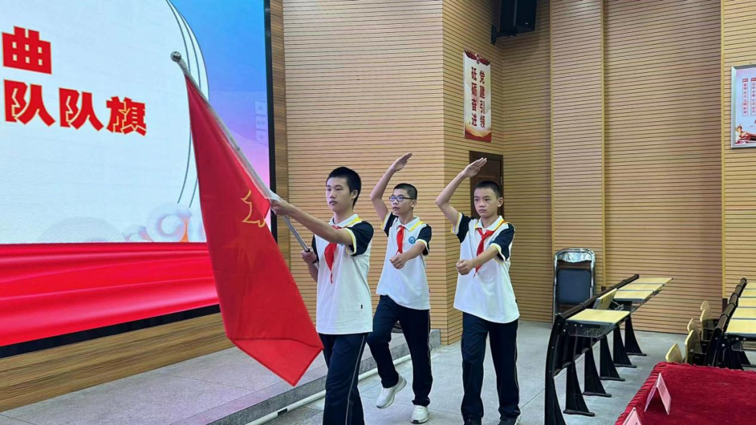 伴随着庄严嘹亮的出旗曲,少先队旗手迈着坚定的步伐,精神抖擞地护卫着队旗入场。全体少先队员肃然站立,向队旗致以最诚挚的队礼,高唱队歌,拉开建队仪式序幕。