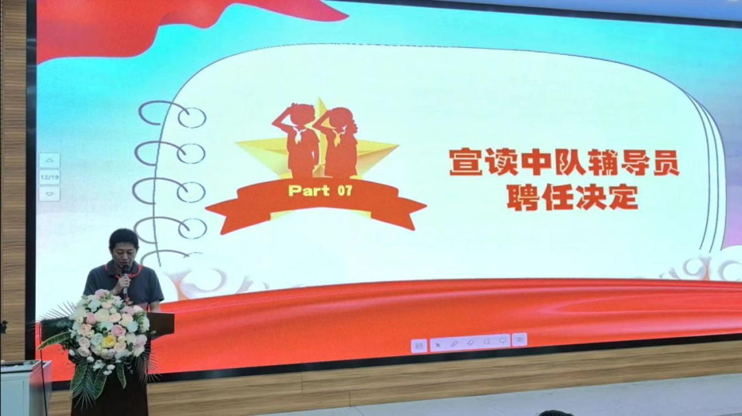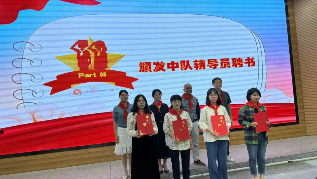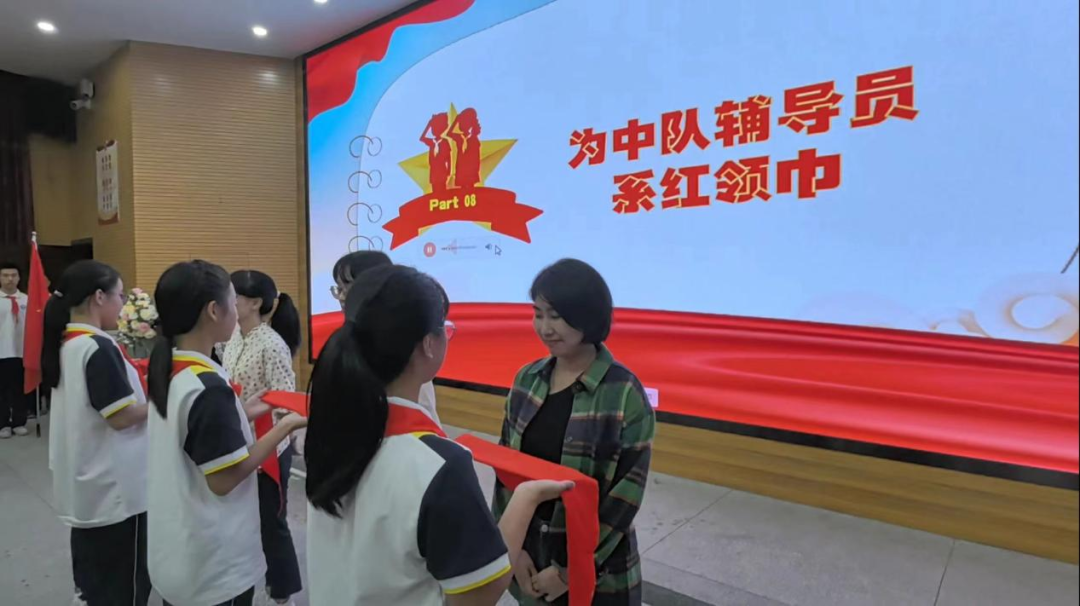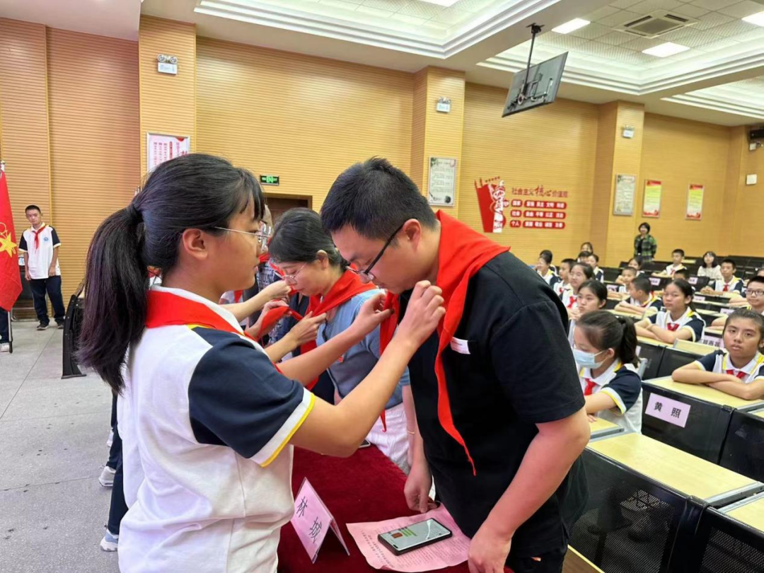 少先队活动的开展离不开一支优秀的辅导员队伍,陈磊副校长宣读新聘中队辅导员名单,由少先队员代表为新聘任的中队辅导员佩戴红领巾,由校领导为辅导员老师们颁发聘书。