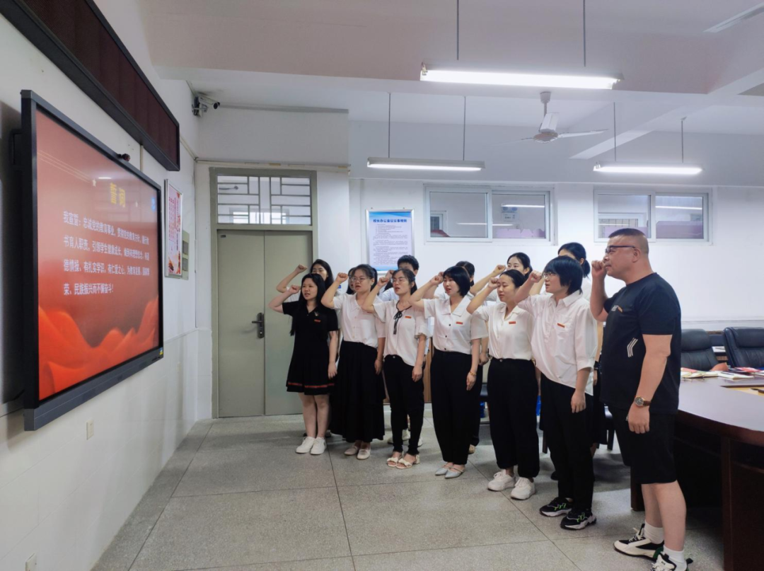 最后,在校党总支陈琛书记的带领下,在大家的见证下,新教师们高举右手,庄严宣誓:“忠诚党的教育事业,贯彻党的教育方针,履行教书育人职责,引领学生健康成长,做到有理想信念、有道德情操、有扎实学识、有仁爱之心,为教育发展、国家繁荣、民族振兴而不懈奋斗!”