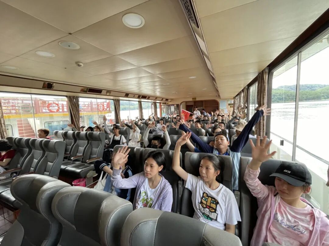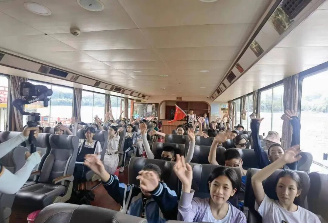 在船上,同学们观察了丹霞地貌的不同形态,欣赏大金湖水上丹霞的壮丽景色,思考了它们形成的原因和过程以及对地质演化的重要意义。