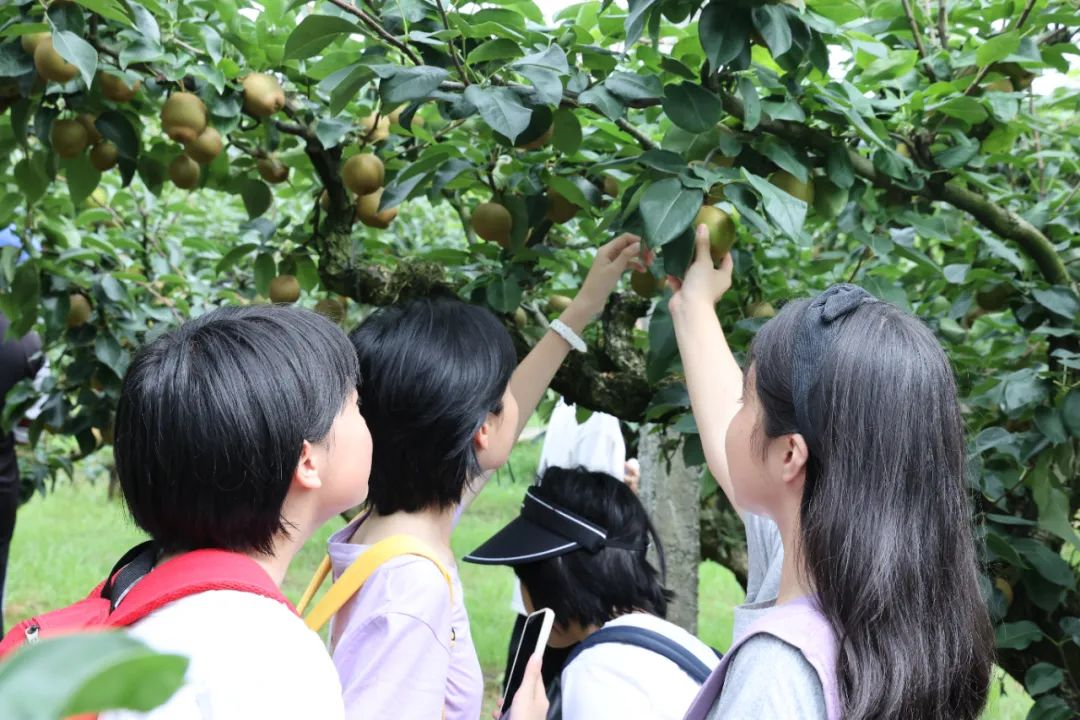 同学们在这里学习翠冠梨的种植技巧、成熟时间、适宜温度等有关的知识,同时,亲身参与了采摘翠冠梨的劳动环节,果农带着大家来到翠冠梨树下,示范采摘技巧,教同学们轻轻用力,将成熟的梨子轻松地摘下来。看完果农的示范后同学们迅速投入到采摘翠冠梨的劳作中,采摘过程中,果农不仅与大家分享了翠冠梨的生长过程和养护方法,还讲述了一些关于其他果树的知识。同学们充分感受到了果农对果树的辛勤付出和热爱,也深刻体验到了劳动教育的魅力。