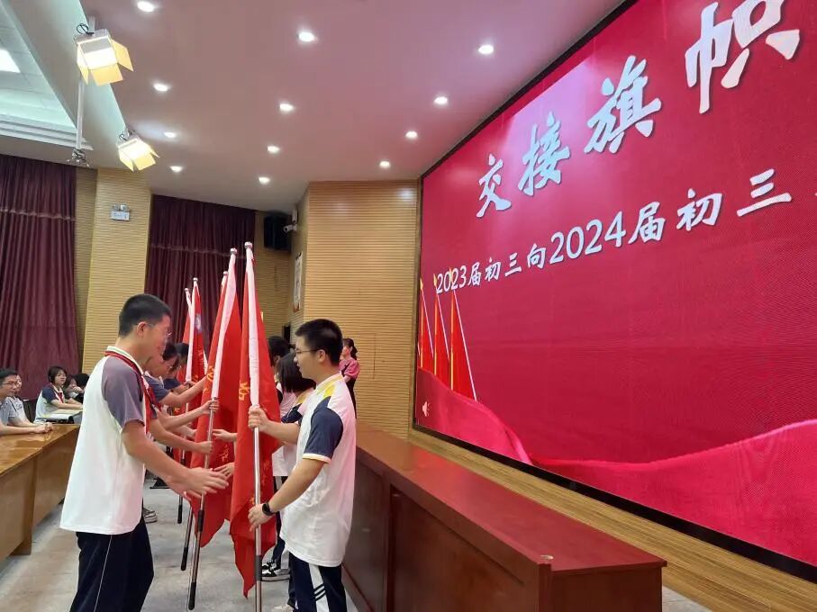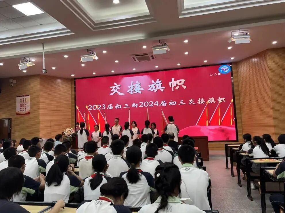 为了让同学们更好地朝着2024届初三的辉煌扬帆启航,动员大会上举行了班旗交接仪式。2024届初三各班班长从上一届学长学姐们手中接过新的班旗,寓意着同学们抬头有旗帜指路,低头有脚踏实地。新初三各班将用汗水挥洒青春,用拼搏诠释梦想,不畏艰难、来年创辉煌。这是一种展望,也是一个开始。展望一个美好的未来,开始一段不凡的征程!