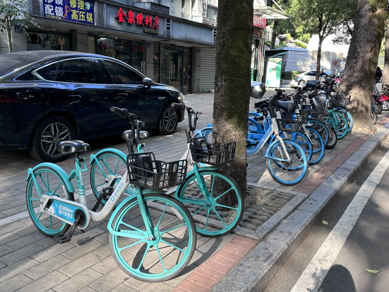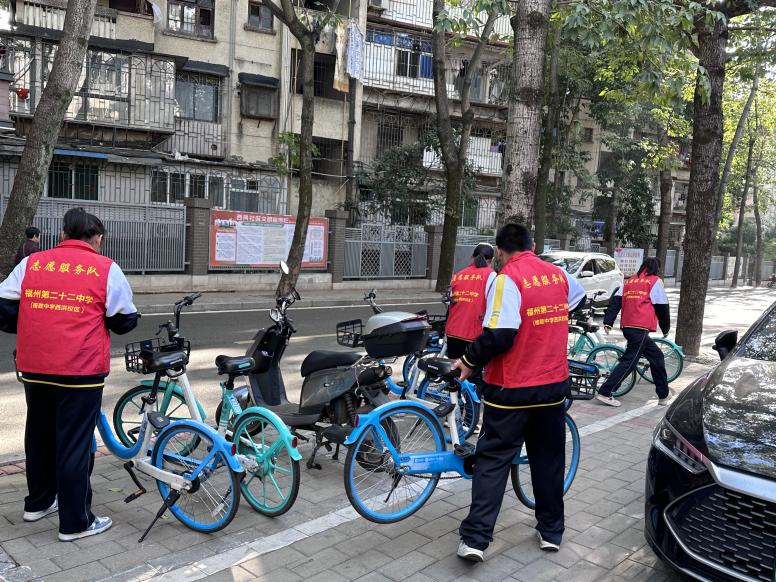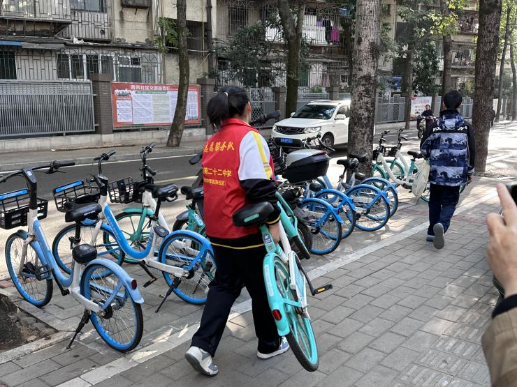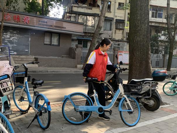 擦完桌子后,朝气蓬勃的同学们又找起了别的事儿,他们齐心协力将随意停放在路边的共享单车整整齐齐的摆成了一排。