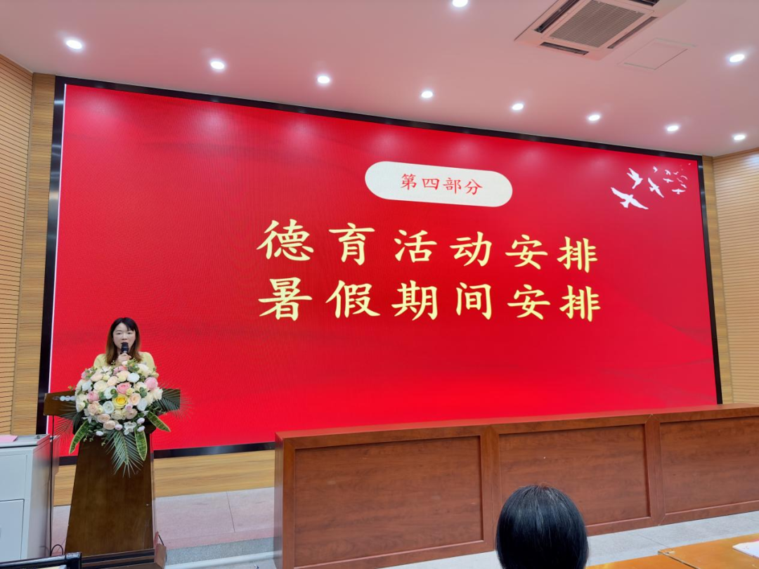 团委书记陈晓霞老师在最后进行暑假期间德育活动的安排。希望同学们能够合理安排假期,适当运动,多参加户外活动,不沉迷于游戏;多阅读课外图书;认真完成暑期作业,引导学生度过一个安全、充实的暑假。