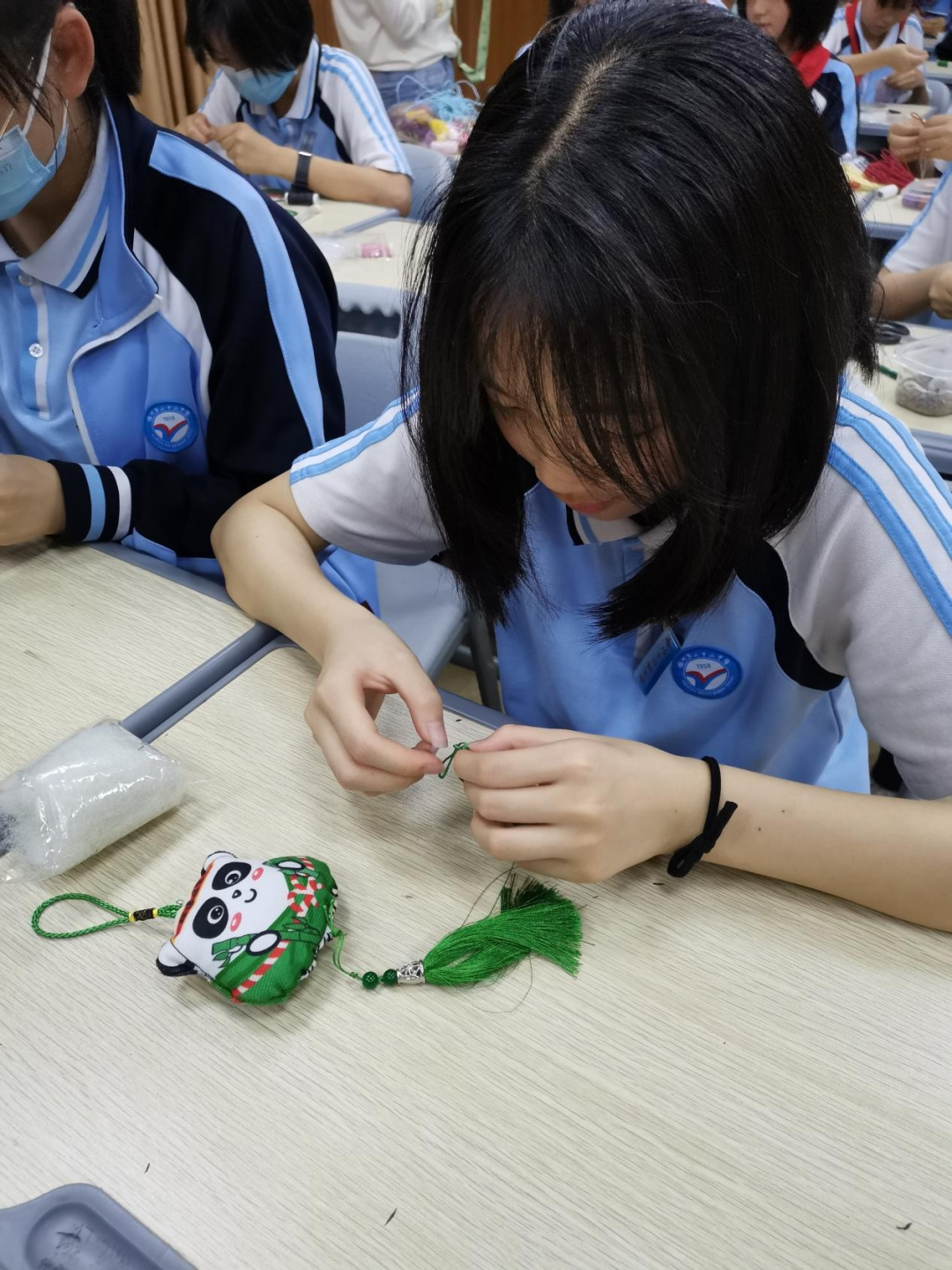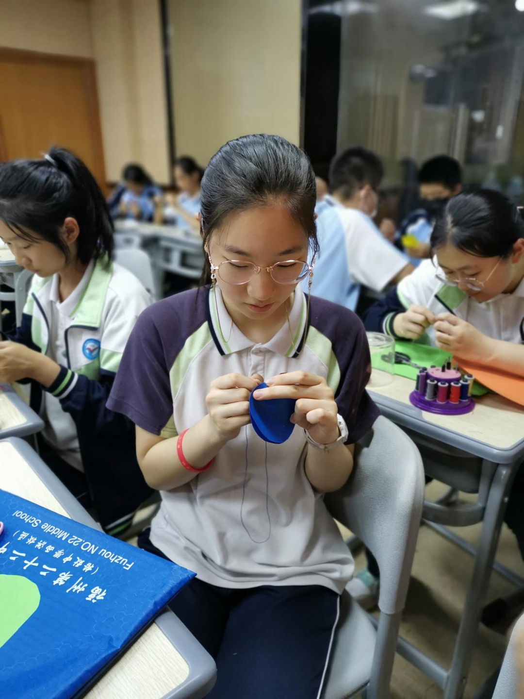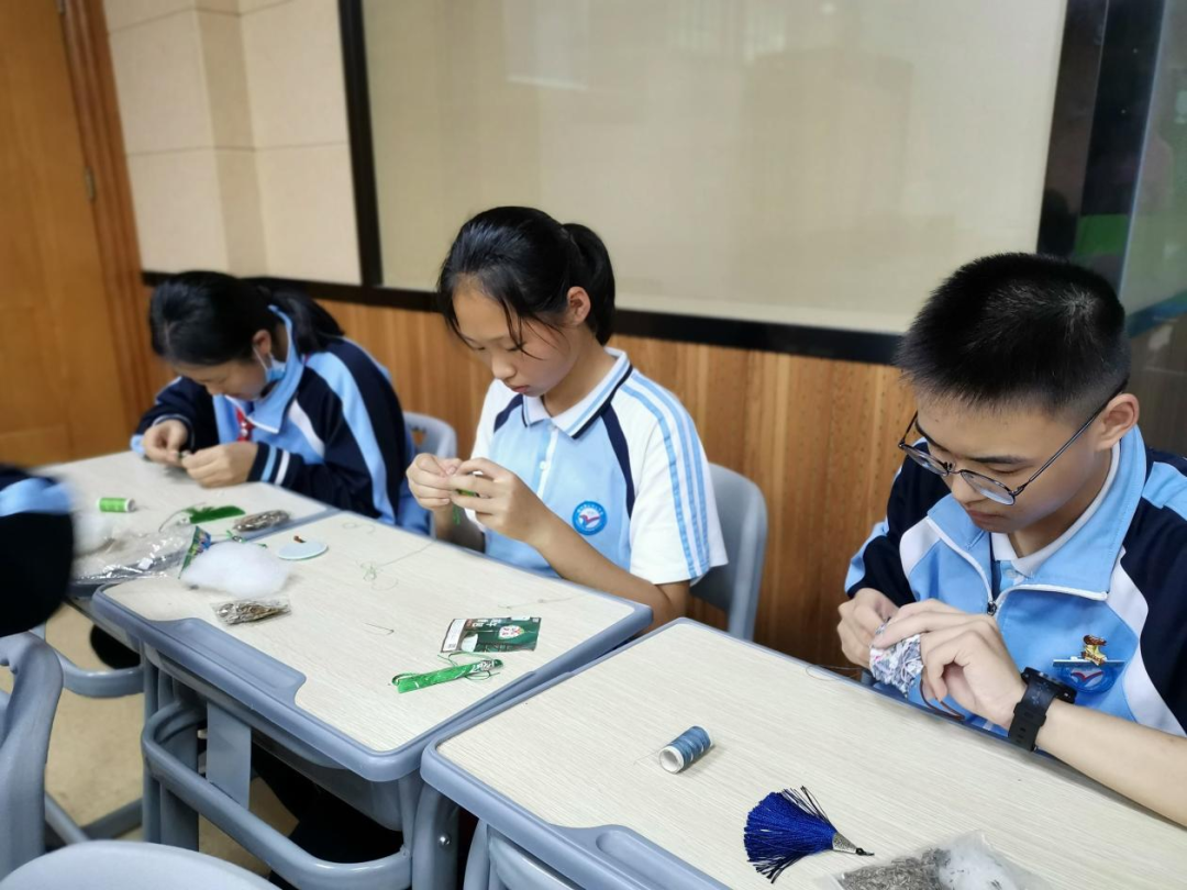 同学们拿出提前准好的材料,穿针、引线、系结、装入艾草,一针一线细密工整,随着一双双巧手上下翻舞,一个个立体饱满、精致美观的香囊跃然而出。