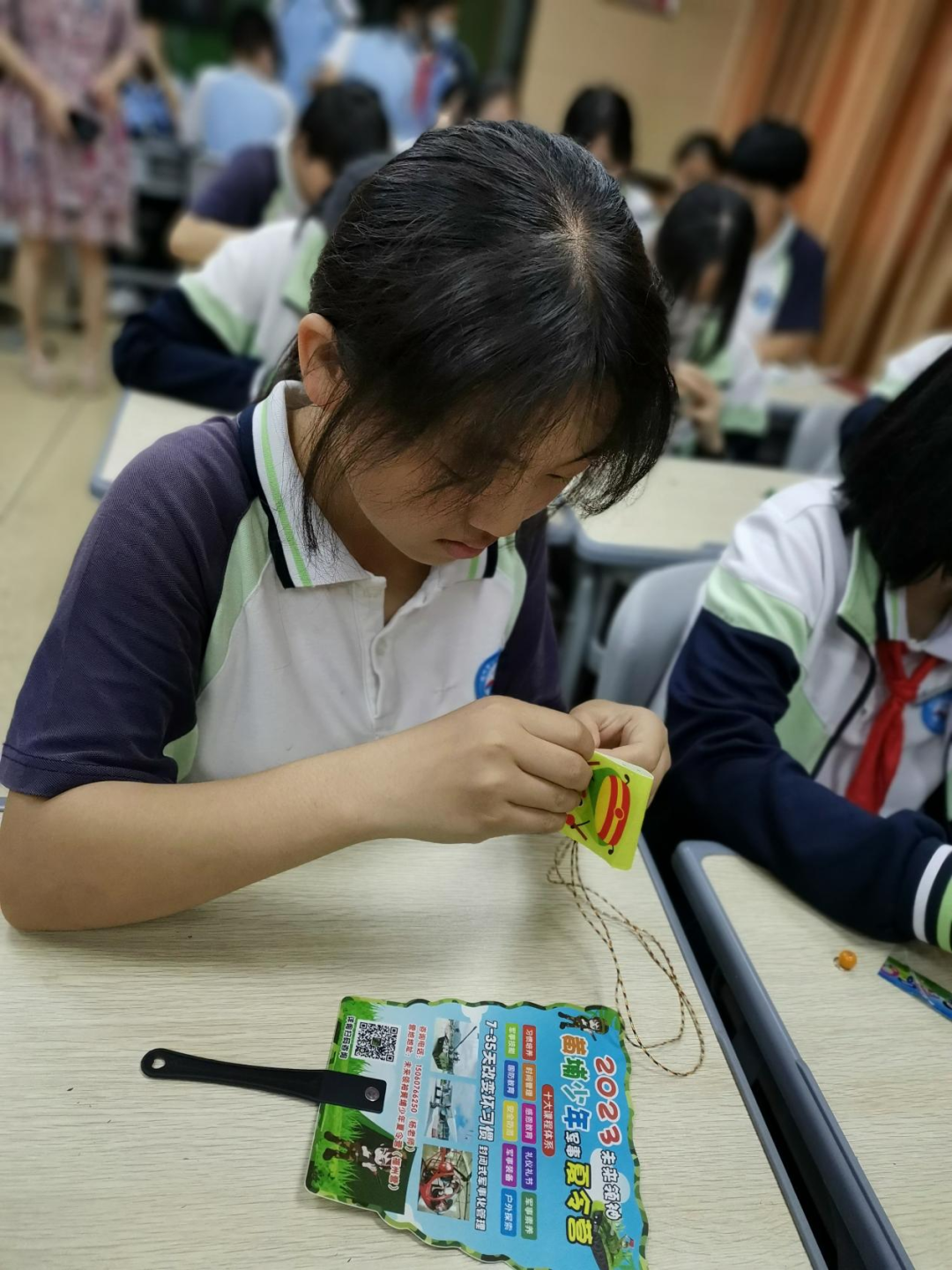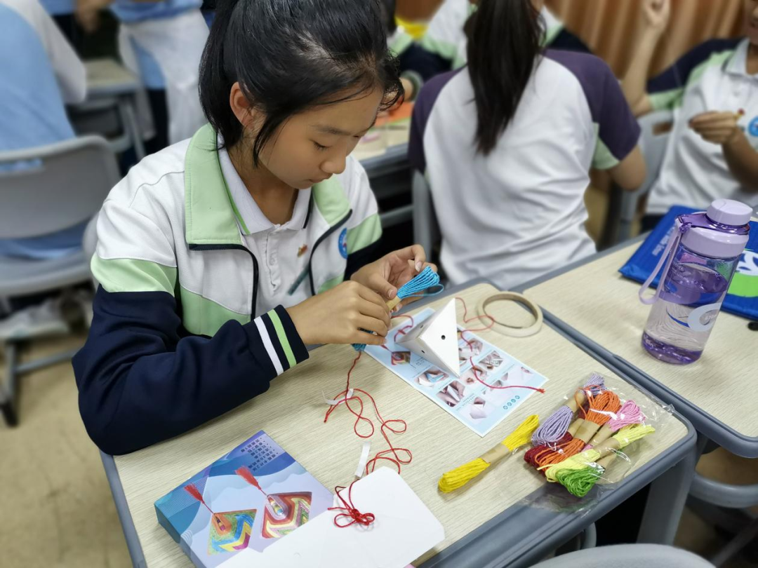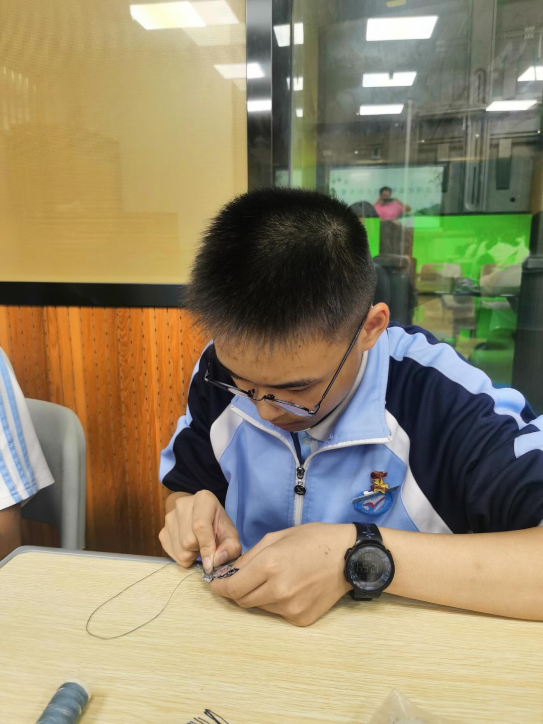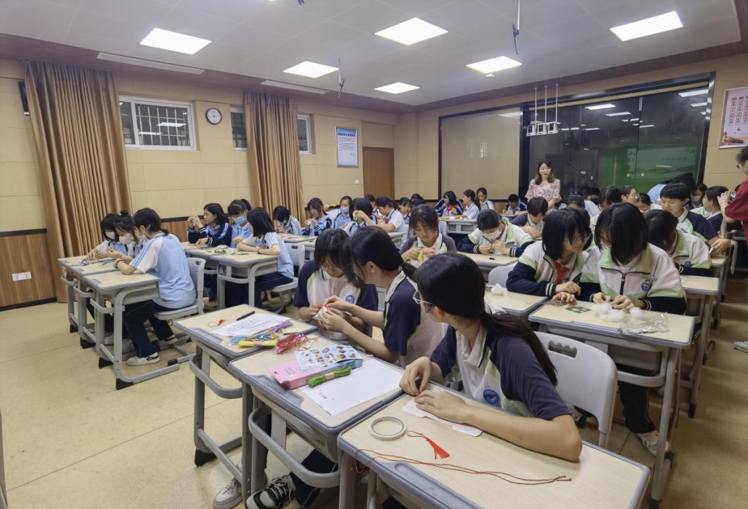 同学们拿出提前准好的材料,穿针、引线、系结、装入艾草,一针一线细密工整,随着一双双巧手上下翻舞,一个个立体饱满、精致美观的香囊跃然而出。