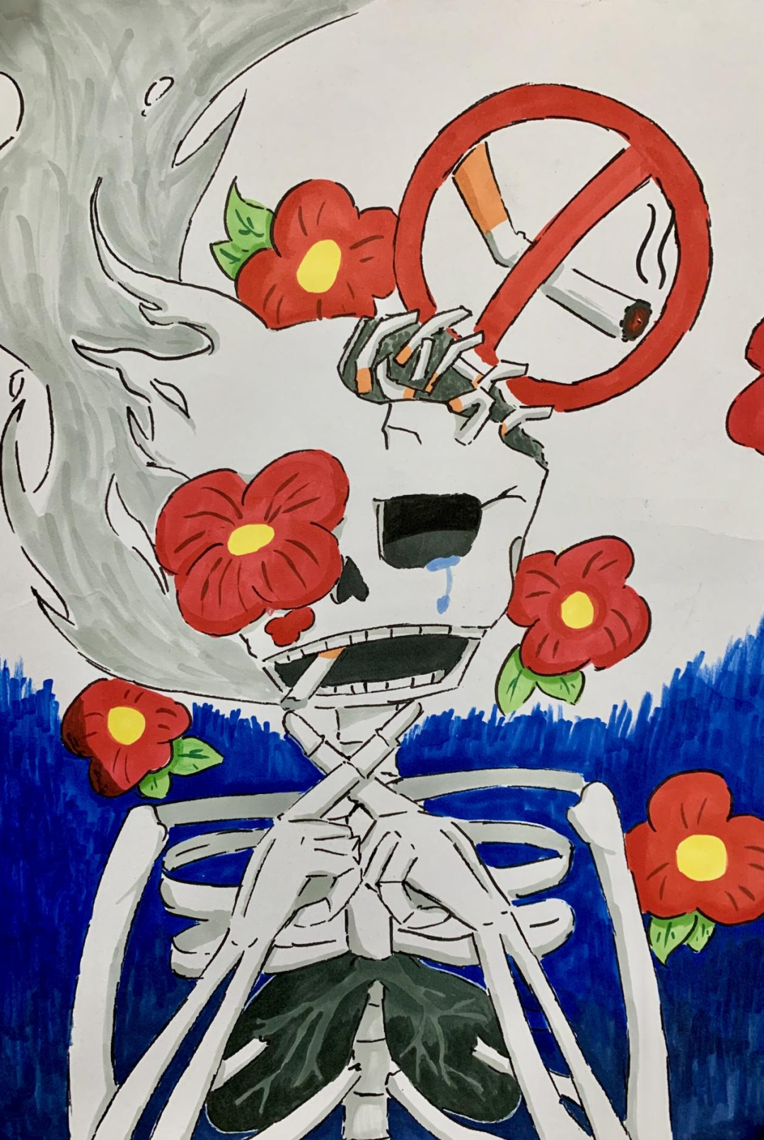 本作品绘有一具骷髅,双手在身前比出禁止手势,表明本画主旨:向烟say no!
