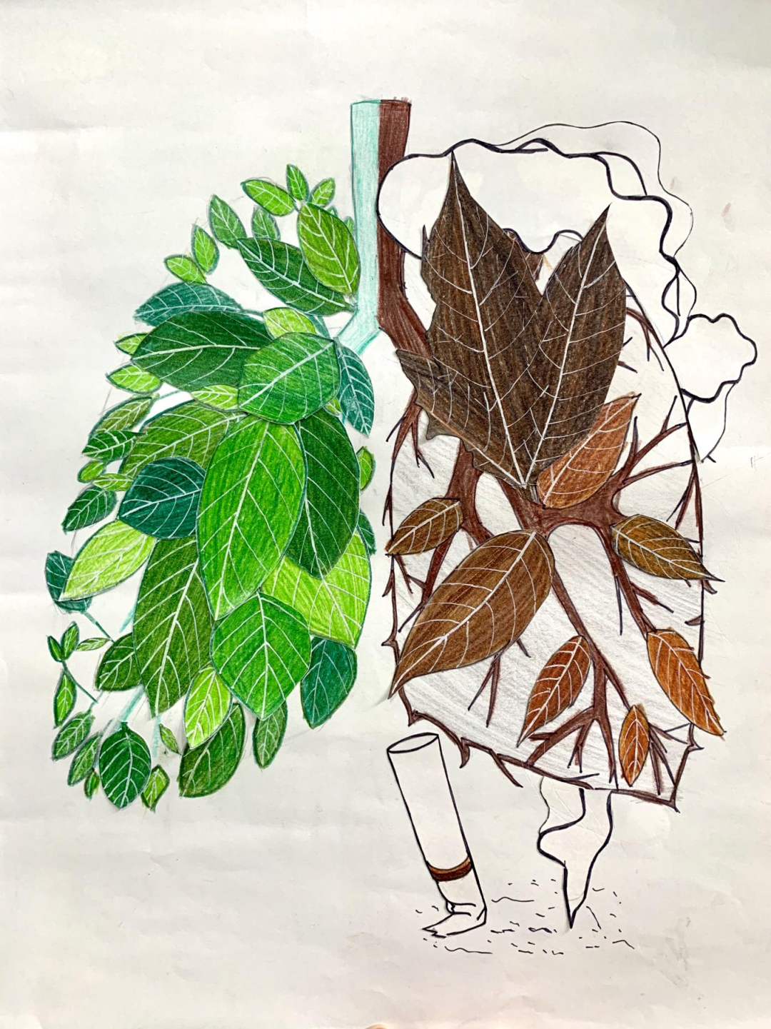 本作品为拼贴画,以肺部为原型,配以树叶装饰。右侧为被烟熏坏的肺,叶片枯黄。左侧为健康的肺,叶片翠绿。画面右下角烟头熄灭,以此点明本画主旨:烟熄绿意生。