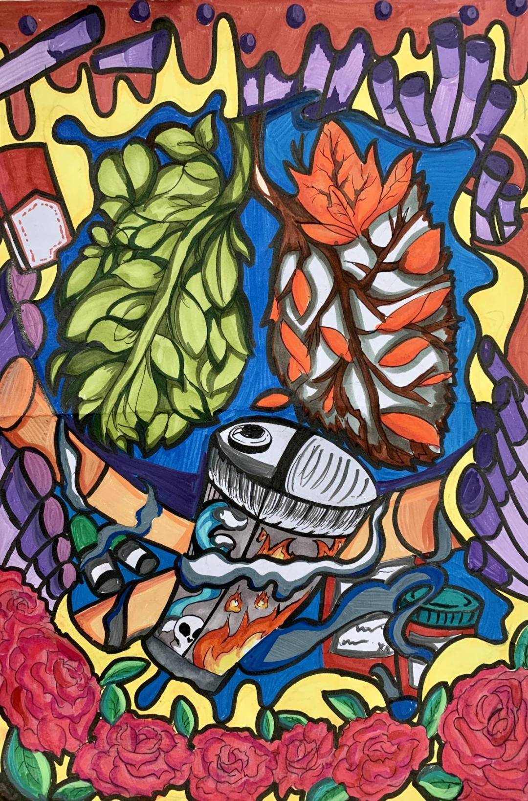 本画以烟、肺和打火机为核心,肺部左、右侧通过叶片颜色对比,表现健康与否两种情况。画中的香烟已折坏,夸张变形的打火机也已无法使用,表明禁烟主题。