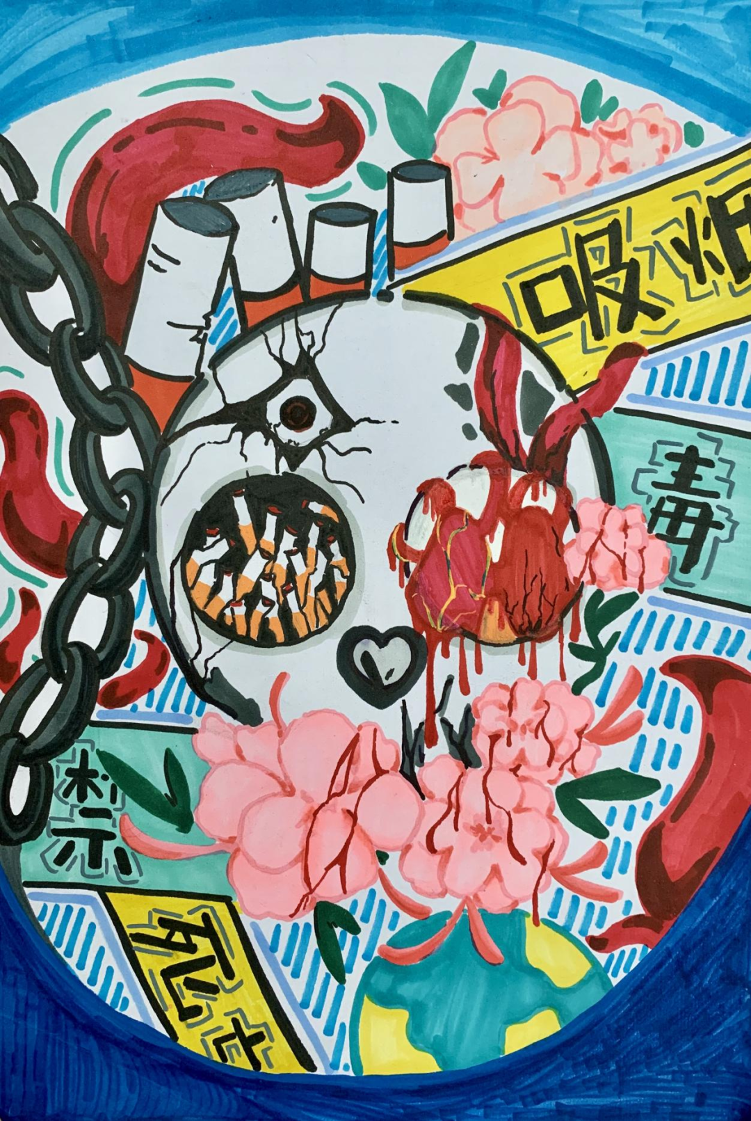 本画以骷髅头为主题,眼窝绘有香烟和鲜红流血的肺,周围配以罂粟花、香烟、铁链等图像,衬托骷髅头,突出禁烟主题。