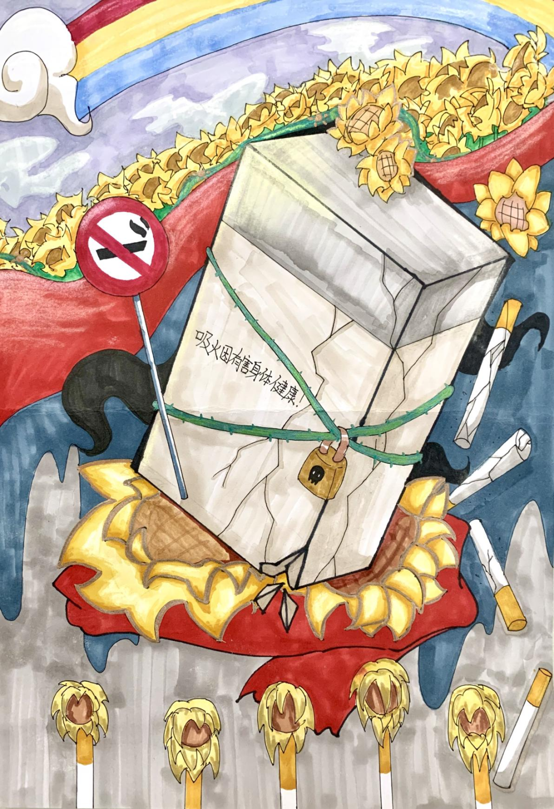 本画以被捆绑的香烟为核心,阐明禁烟主题。画面中绘有健康生长的向日葵和枯萎的向日葵,两相对比,强调珍爱健康 远离香烟。