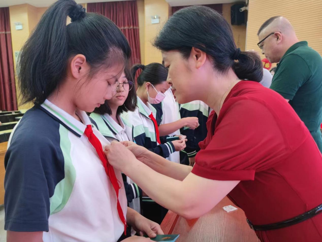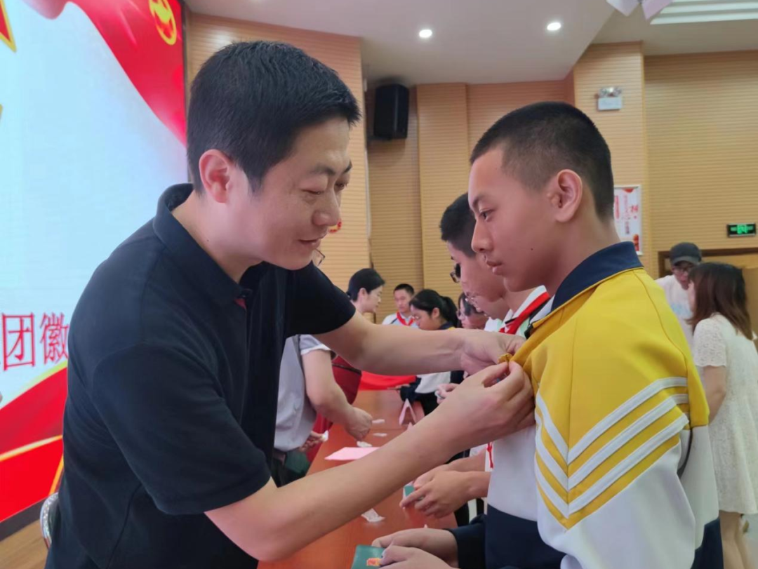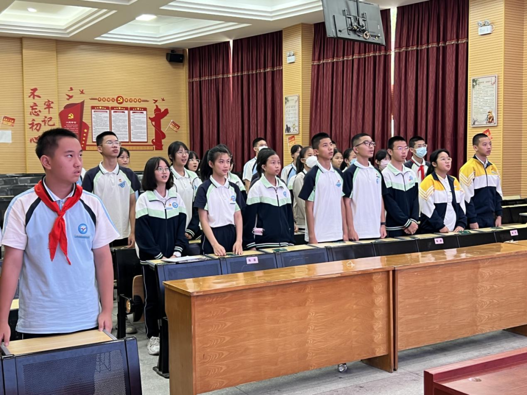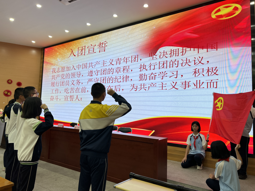 在初三1班张诚镔同学的领誓下,新团员们面向团旗,高举右手,庄严宣誓,誓言里饱含真挚与热情,他们用铿锵有力的誓言表达了作为共青团员的责任和担当。