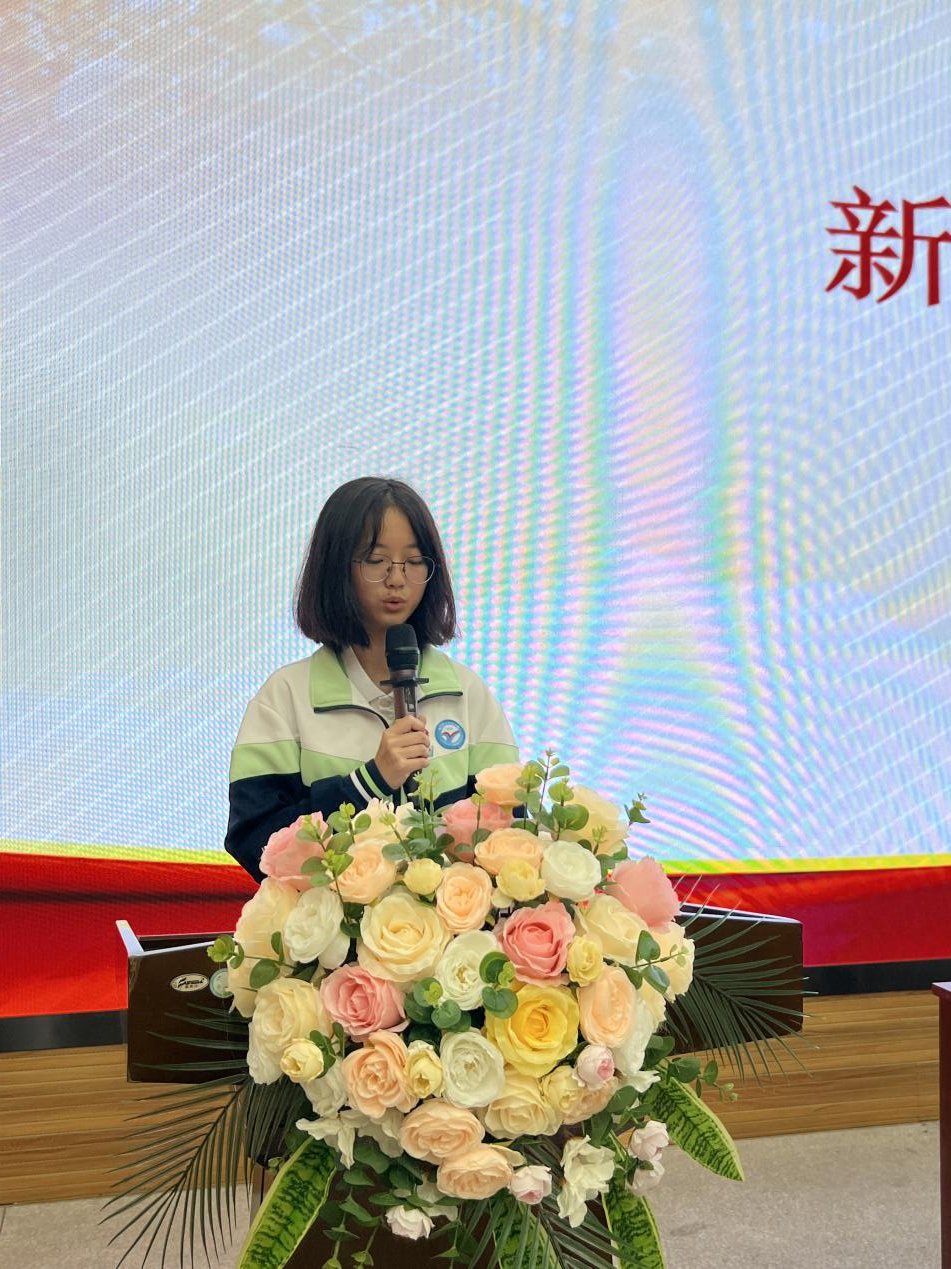 初二1班陈诗雅同学作为新团员代表发言。她表示作为一名共青团员,应树立崇高的理想,履行团员义务,脚踏实地,甘于奉献,不忘初心,砥砺前行,彰显共青团员的责任和担当。