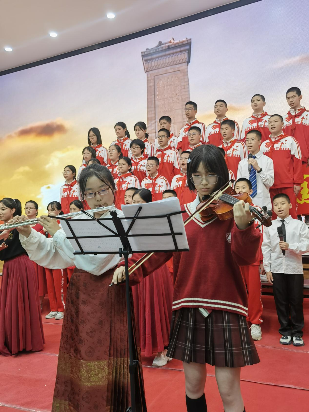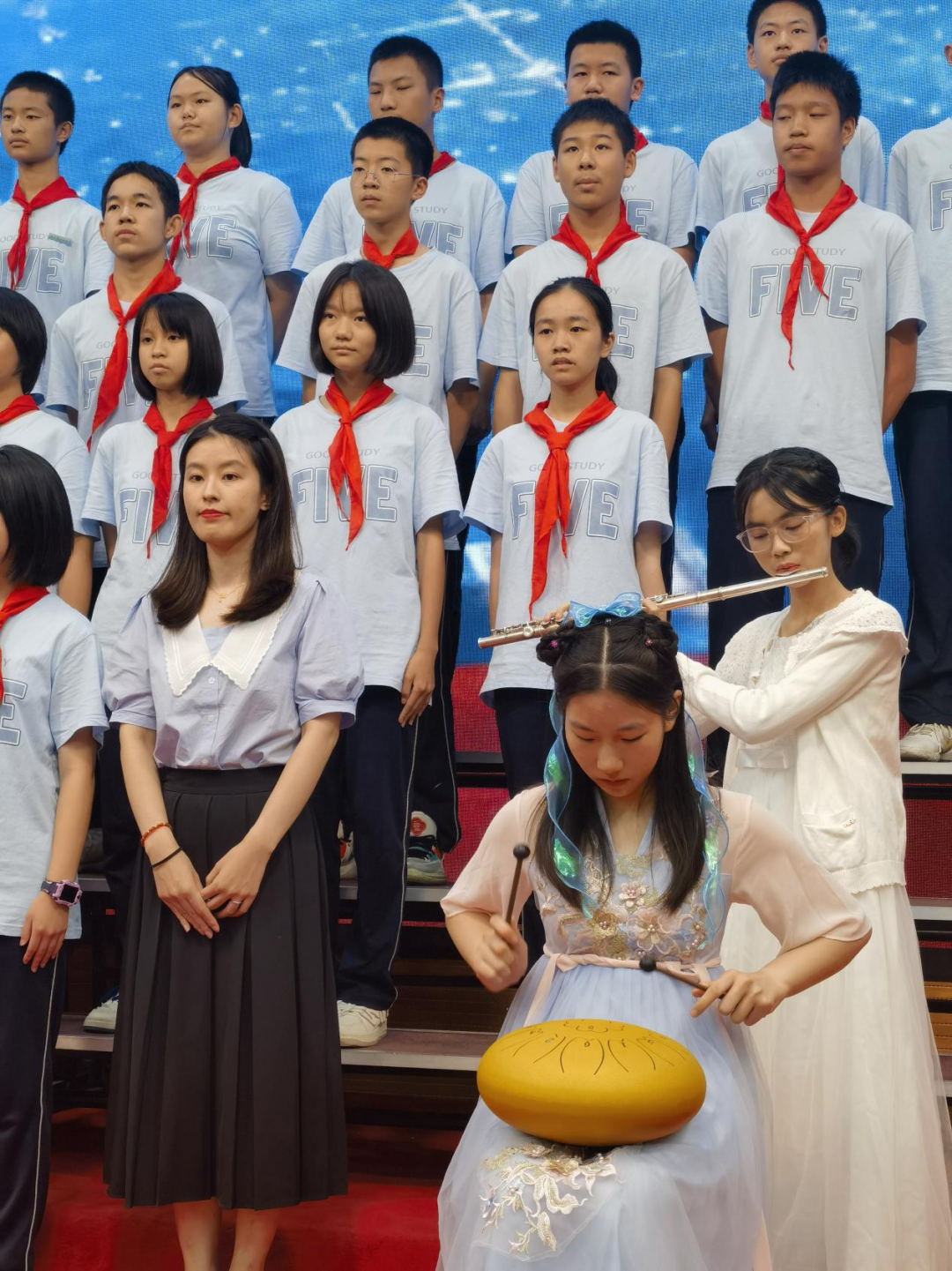 “艺”起绽放二十大,歌谱华章心向党。同学们的歌声嘹亮,唱响着青春少年的雄心壮志,同学们的诵读激昂,弘扬着二十大的宏伟篇章。钟鼓、长笛、提琴、古筝同学们精湛的技艺在展现,书法、扇舞、剑舞、华服中国的文化在传承。
