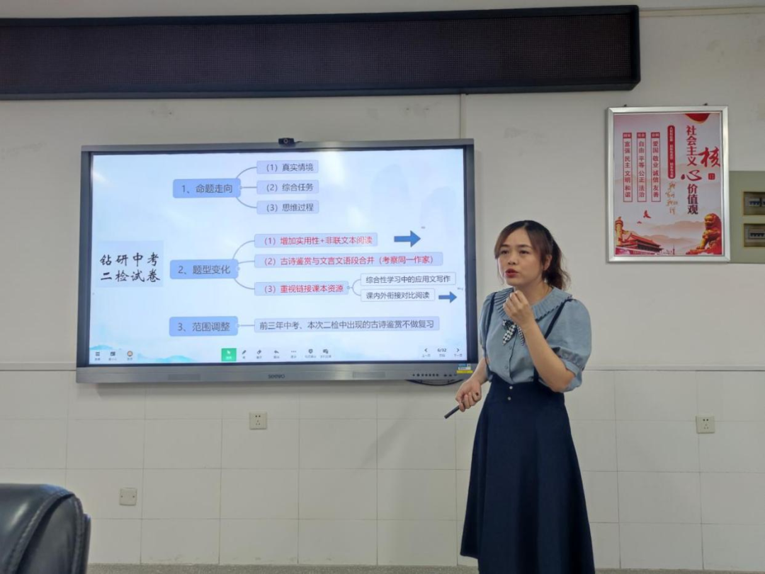 语文组潘茜娜老师针对中考语文冲刺阶段的复习策略作了详细介绍,关注得分板块,寻求突破点。第一,依托质检卷,做针对性训练;第二,回归教材,关注热点;第三,立足作品,有序重构。最后,因材施教,通力协作出成效。