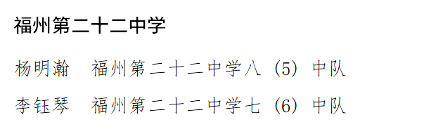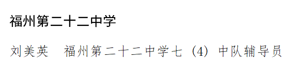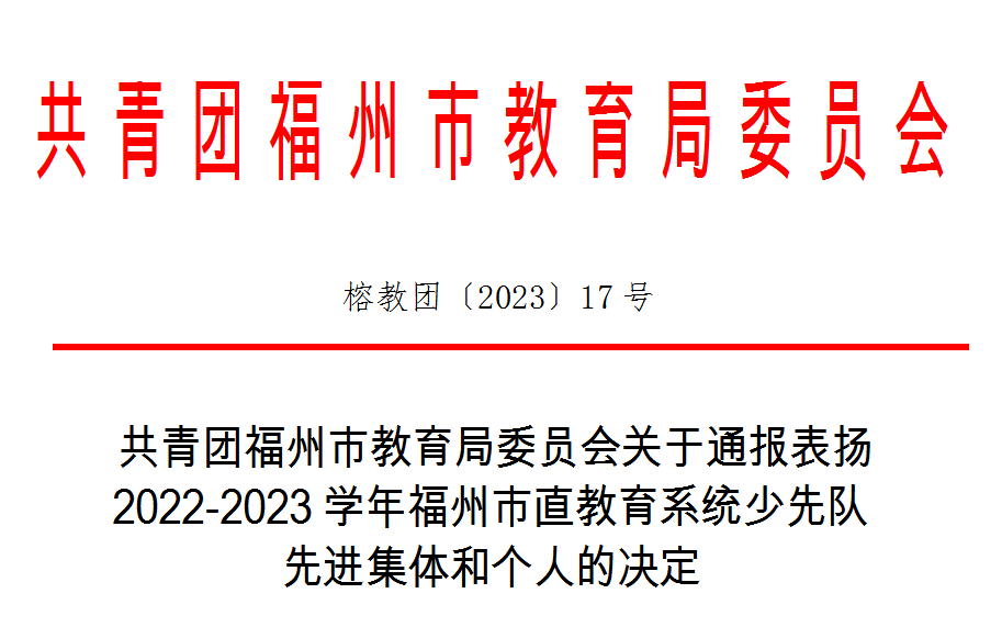 近日,共青团福州市教育局委员会关于通报表扬2022-2023学年福州市直教育系统少先队先进集体和个人的决定下发,点点taptap官网八 (5) 中队杨明瀚、点点taptap官网七 (6) 中队李钰琴荣获“优秀少先队员”称号;点点taptap官网七 (4) 中队辅导员刘美英荣获“优秀少先队辅导员”称号;点点taptap官网八 (1) 中队荣获“优秀少先队中队”称号。让我们对获得荣誉的集体和个人表示祝贺!