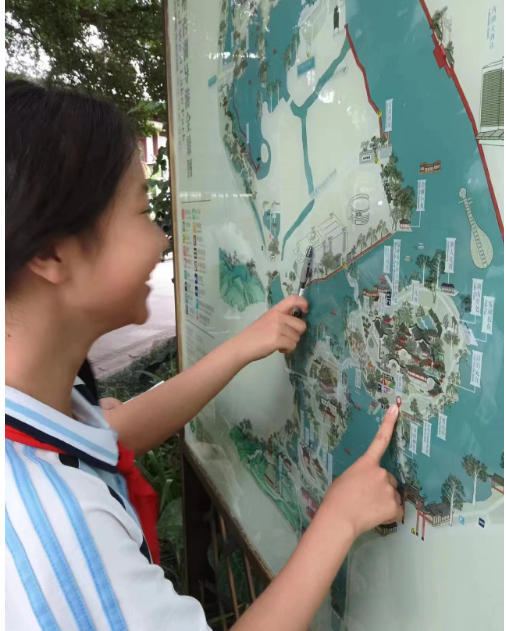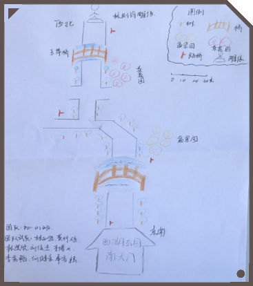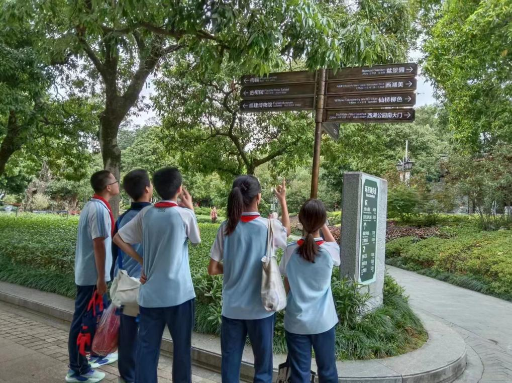 博物馆奇妙之旅的任务从踏入西湖南大门就开始了。同学们以小组为单位,认真观察西湖导览图,驻足研究指向牌,记录西湖建筑景观,认真完成任务——设计从西湖南大门到自然馆的路线最佳路线图。设计要求:利用所学地理知识,标明比例尺、方位、和标注主要建筑及名称,路程便捷。同学们调动所学知识开动脑筋、着手设计构图,从学中做,做中学,充分体会掌握知识带来的乐趣。