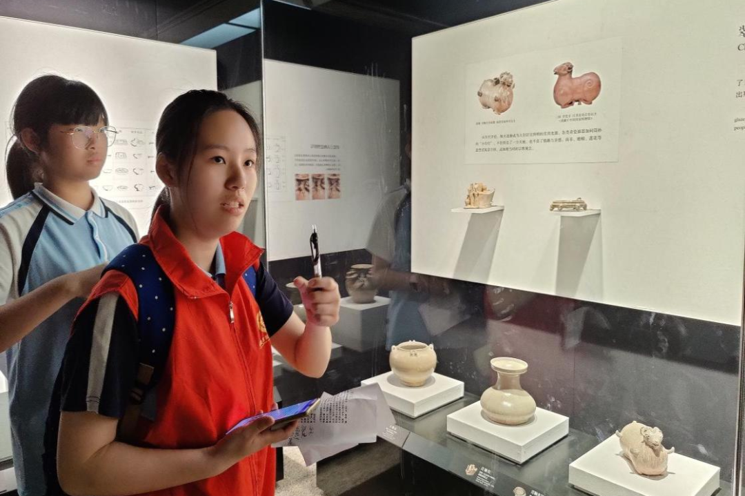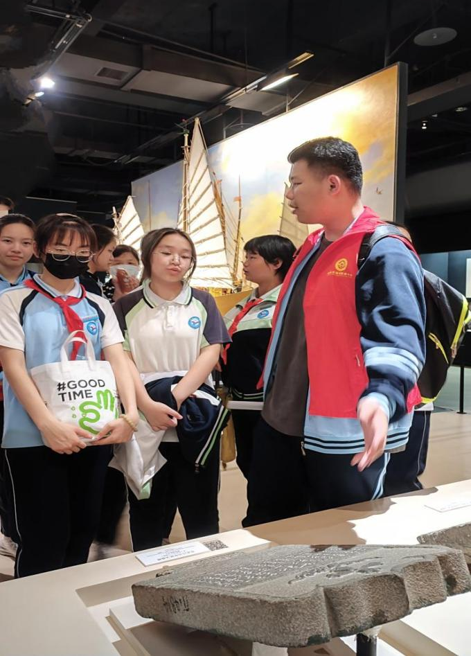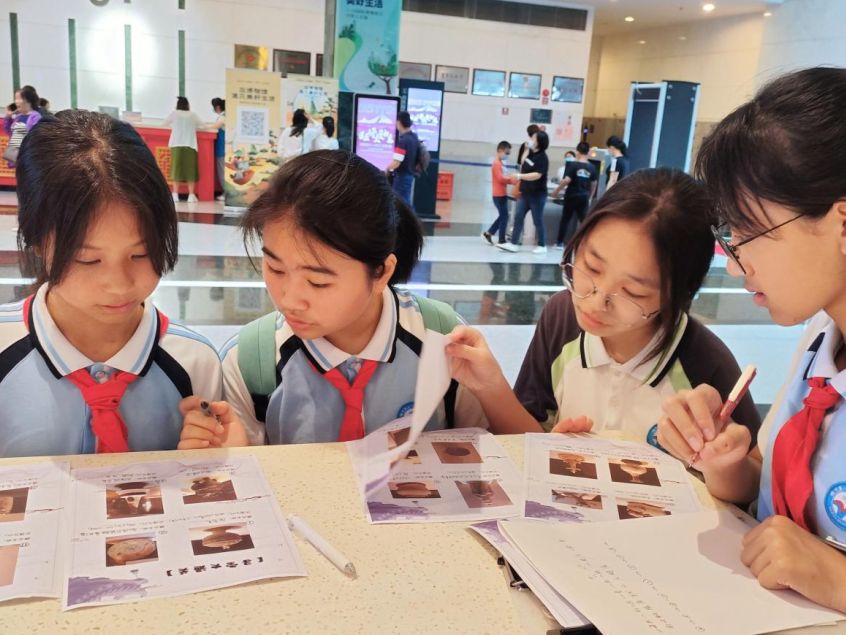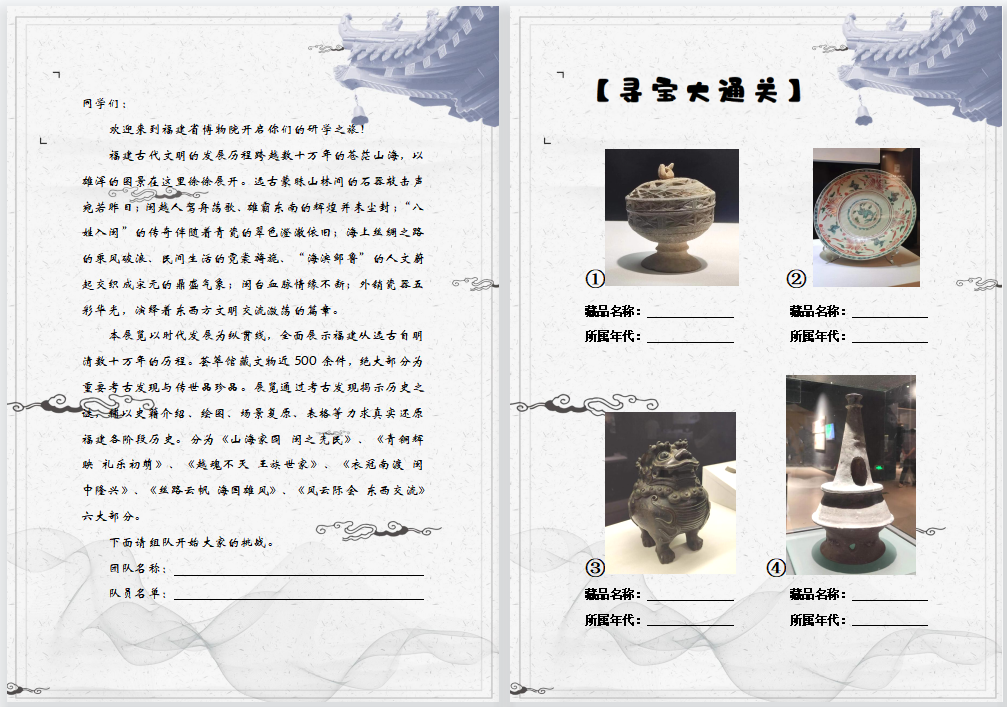 博物馆之旅的第二站同学们来到“福建古代文明之光”展厅。在这里历史学科的叶雨雁老师已经为同学准备了本次寻宝任务——“遇见文物 寻宝大通关”,同学们认真阅读研学材料,了解研学任务,并组队开展综合实践研学活动。