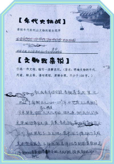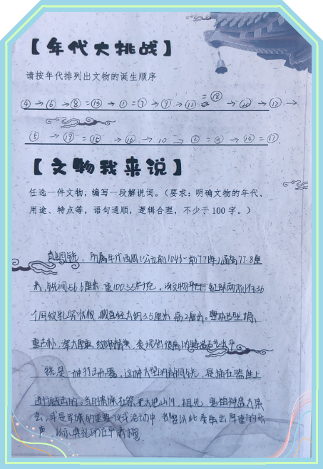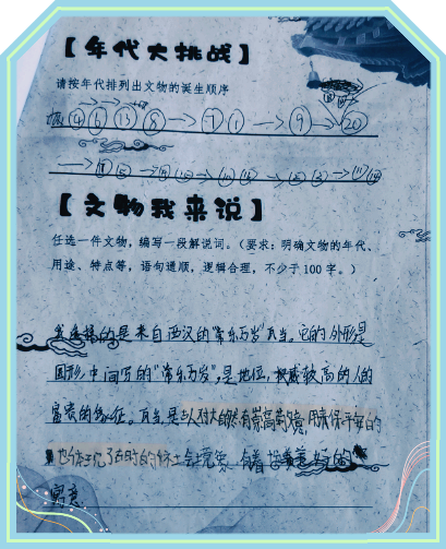 活动最后,历史指导教师叶雨雁从历史时间轴的发展为同学们做了典型文物的讲解与活动总结,拉近了历史与现实的距离,引导同学们从文物中感受文化自豪感,培育了爱国爱乡的思想感情。