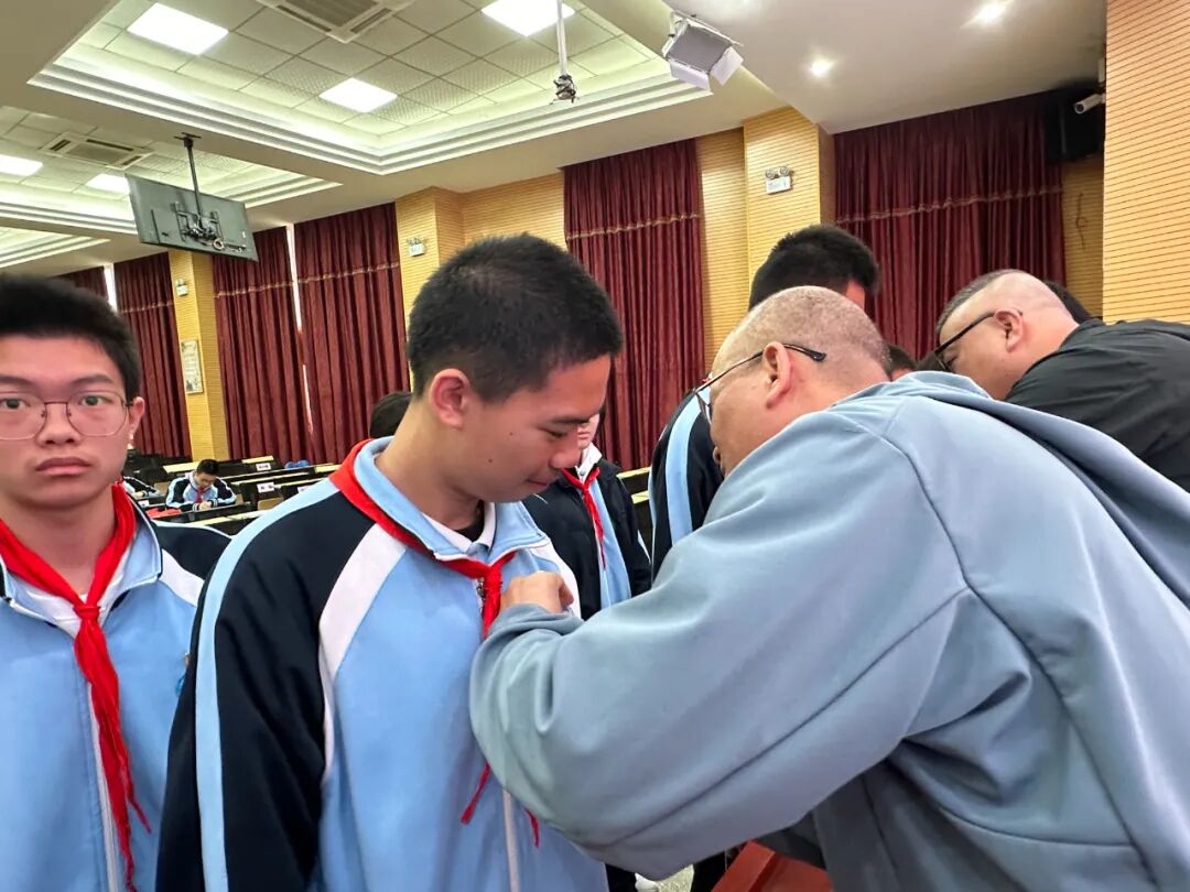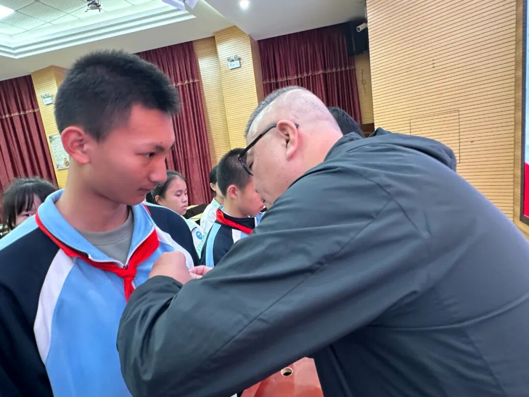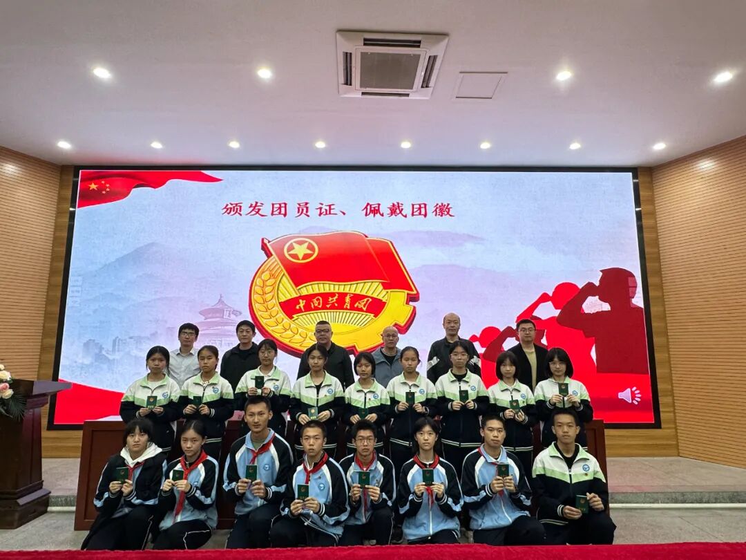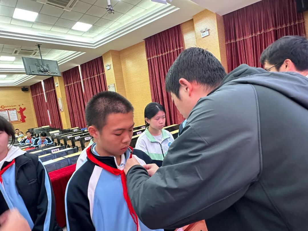 校领导们为新团员颁发团员证并佩戴团徽。熠熠生辉的团徽是团员身份的象征,是肩负重任的标志,提醒着青年团员时刻牢记自己的团员身份。