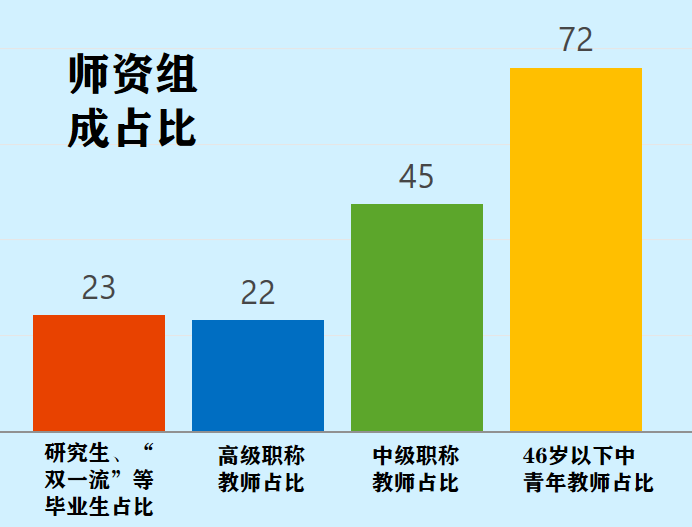 目前学校共计53名在职在编教师,其中高级教师12名,占22%;中级教师24名,占45%;46岁以下的中青年教师38名,占72%;名优骨干教师4名;研究生、“双一流”大学、教育部直属师范类院校毕业生以及各类院校优秀毕业生12名,占比23%。我们学校地处市中心,又是市属校,即使是新招聘的新教师质量也非常高,其中不乏有经验的老教师。