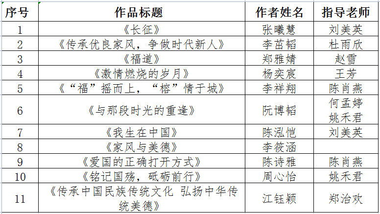 经过激烈的角逐,11件作品最终入围兰花圃2023福州市“福声·心声”师生有声美文大赛半决赛,作品内容涉及了红色经典、家风家训、福文化历史等各个方面。这些作品不仅是同学们语言表达的展示, 更是他们思想的抒发,对提升国家文化软实力和中华文化影响力有着积极的推进作用。