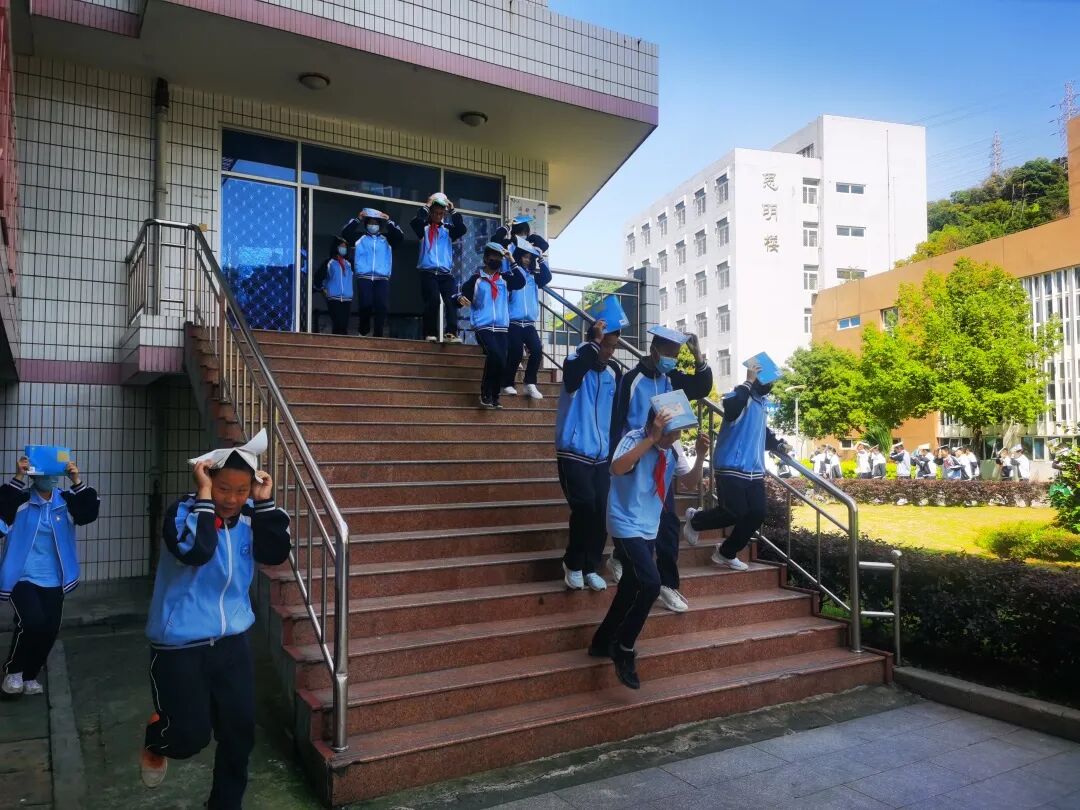 5月10日9:40演练警报声响起,负责楼道出口和转角的安全员老师第一时间到达工作岗位,负责疏散的各班班主任及时组织学生采取自救措施,学生用书包或厚书本护住头部,躲在教室内课桌下或墙角边。随后班主任组织学生按照预定逃生路线快速有序地向校园操场紧急疏散。在撤离过程中,学生们能够按照要求双手抱头,保护好自己的头部,不推挤不喧哗,在规定时间有序撤离到操场中央。到达操场后,教师及时清点人数,检查学生情况,向陈磊副校长报告学生撤离情况。