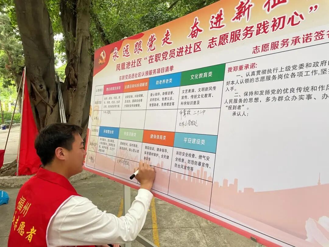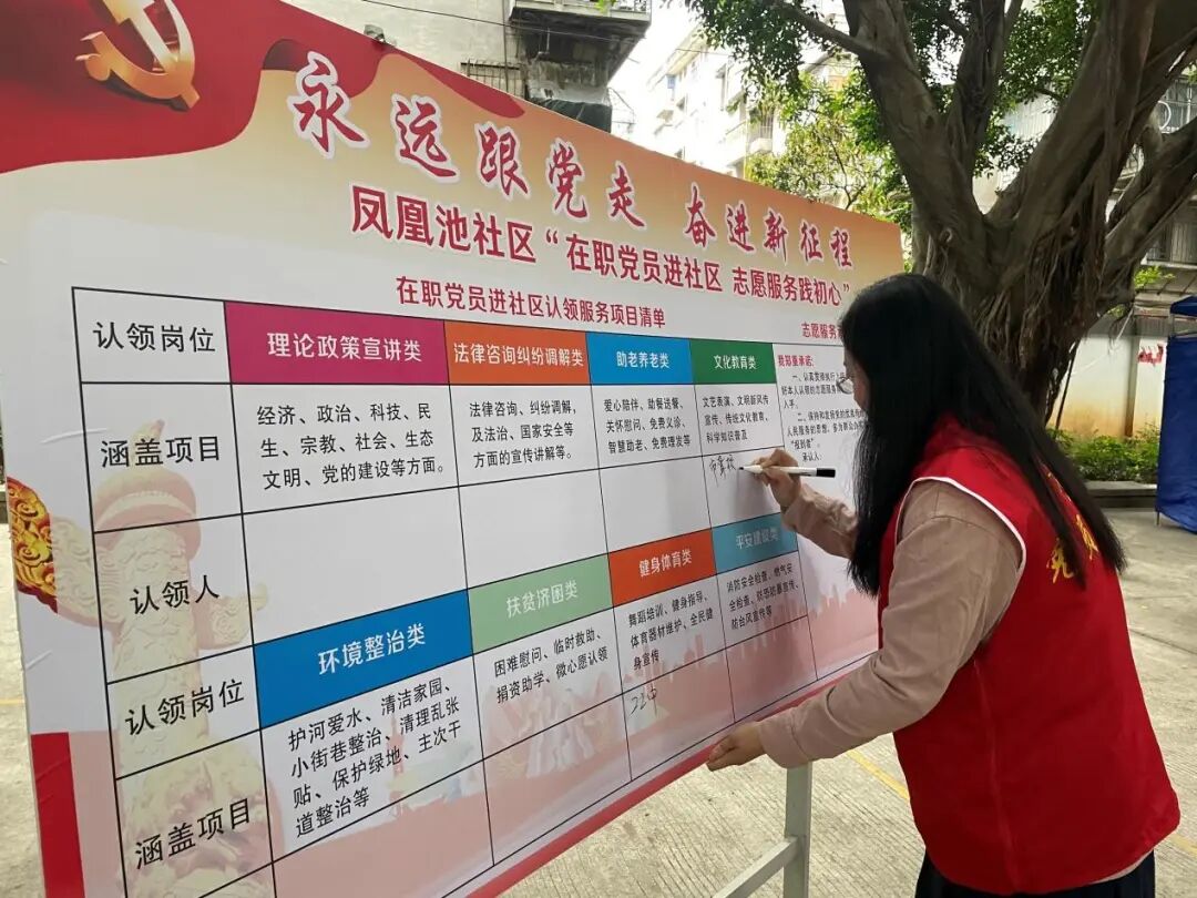 为实现党员与群众的良性互动、同频共振。活动现场,凤凰池社区党委结合实际,以设立认领服务项目清单的方式搭起群众“所需”与在职党员“能为”的桥梁和纽带,通过双方的“许愿”和“接单”,让爱实现了“双向奔赴”。我校6名在职党员、志愿者认领服务岗位,并签下了承诺,以身体力行的服务,为居民传递一份份正能量。