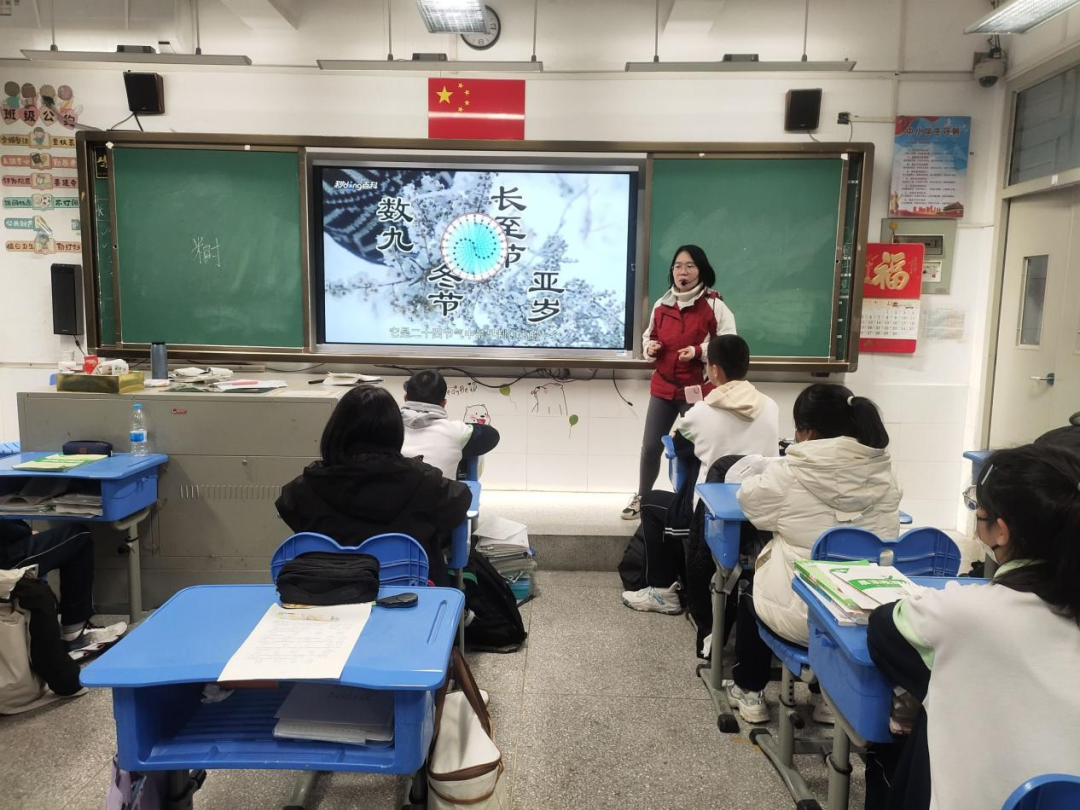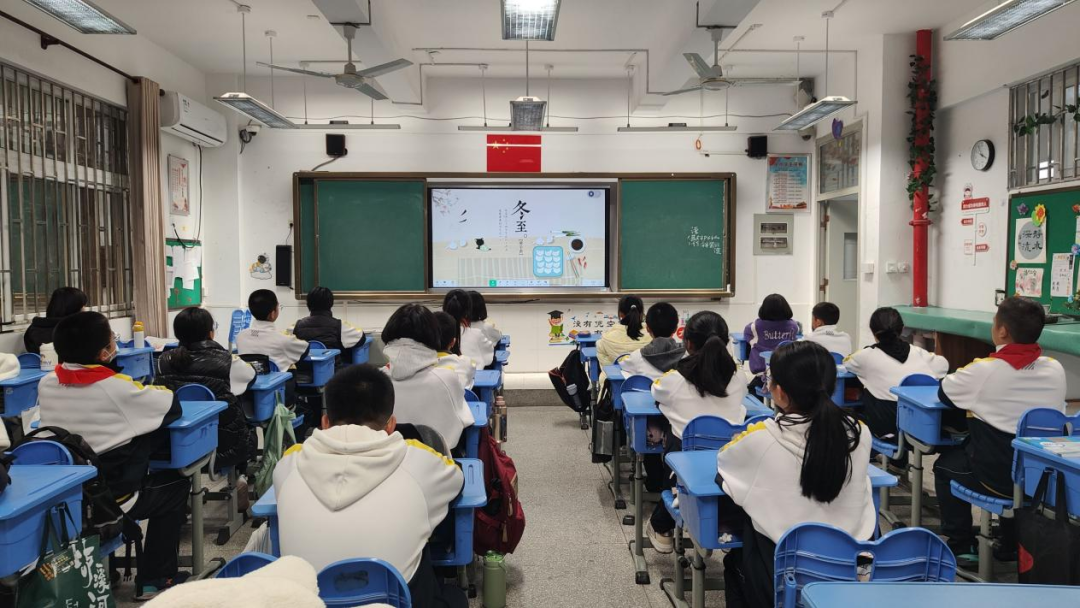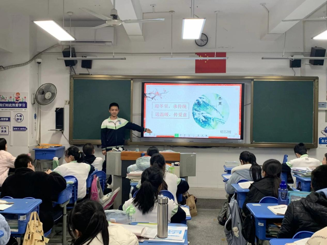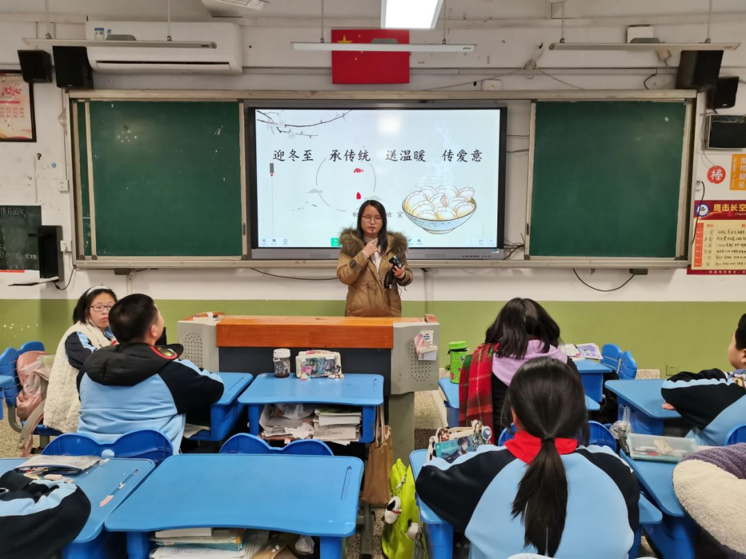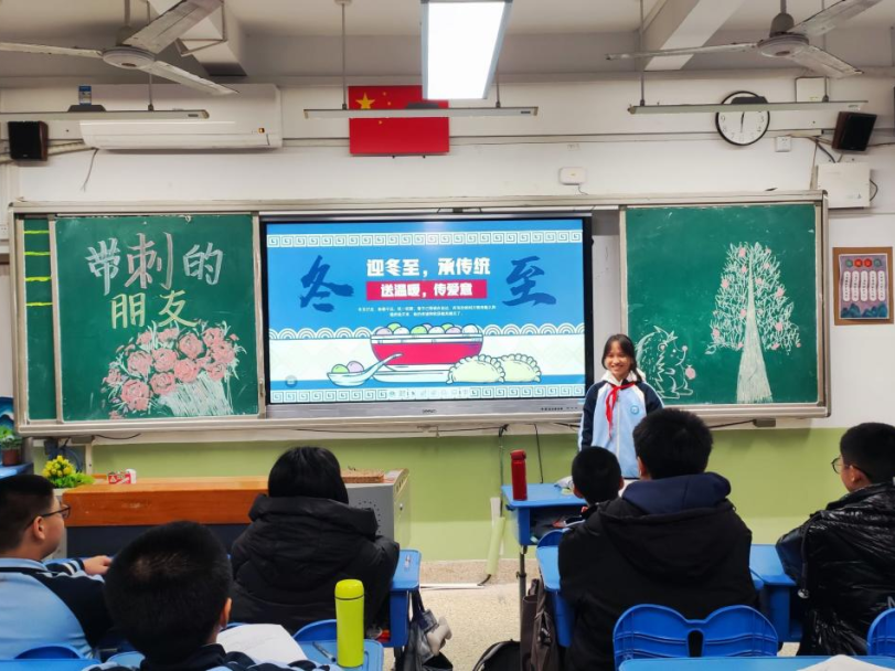 各班级也开展了冬至主题班会。班主任们通过历史典籍、传唱“二十四节气歌”、养生杂谈等形式,向同学们介绍了“冬至”的起源、饮食文化、本地习俗等有关的知识,加深了同学们对冬至的了解,感受传统文化的独特魅力。