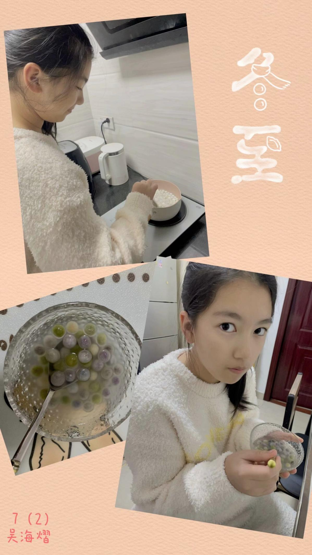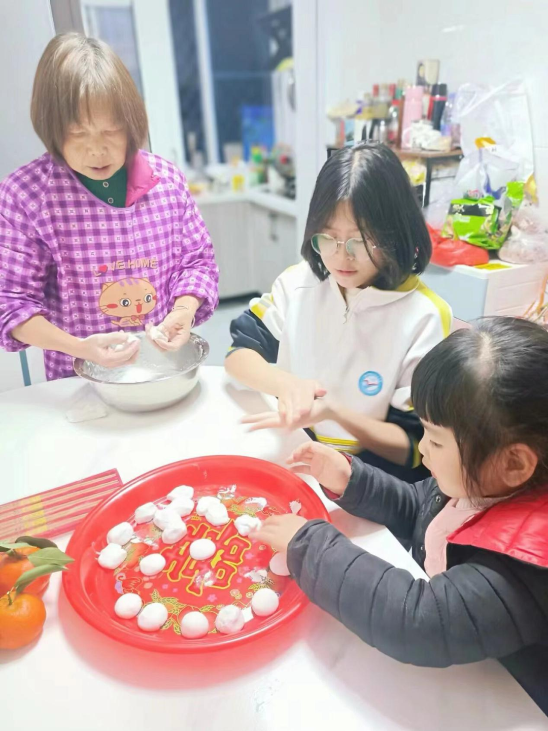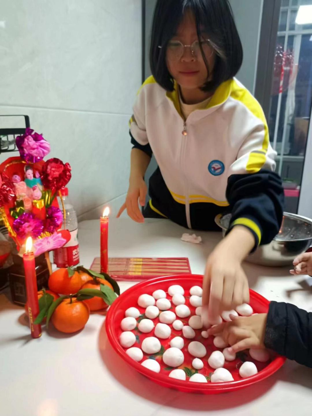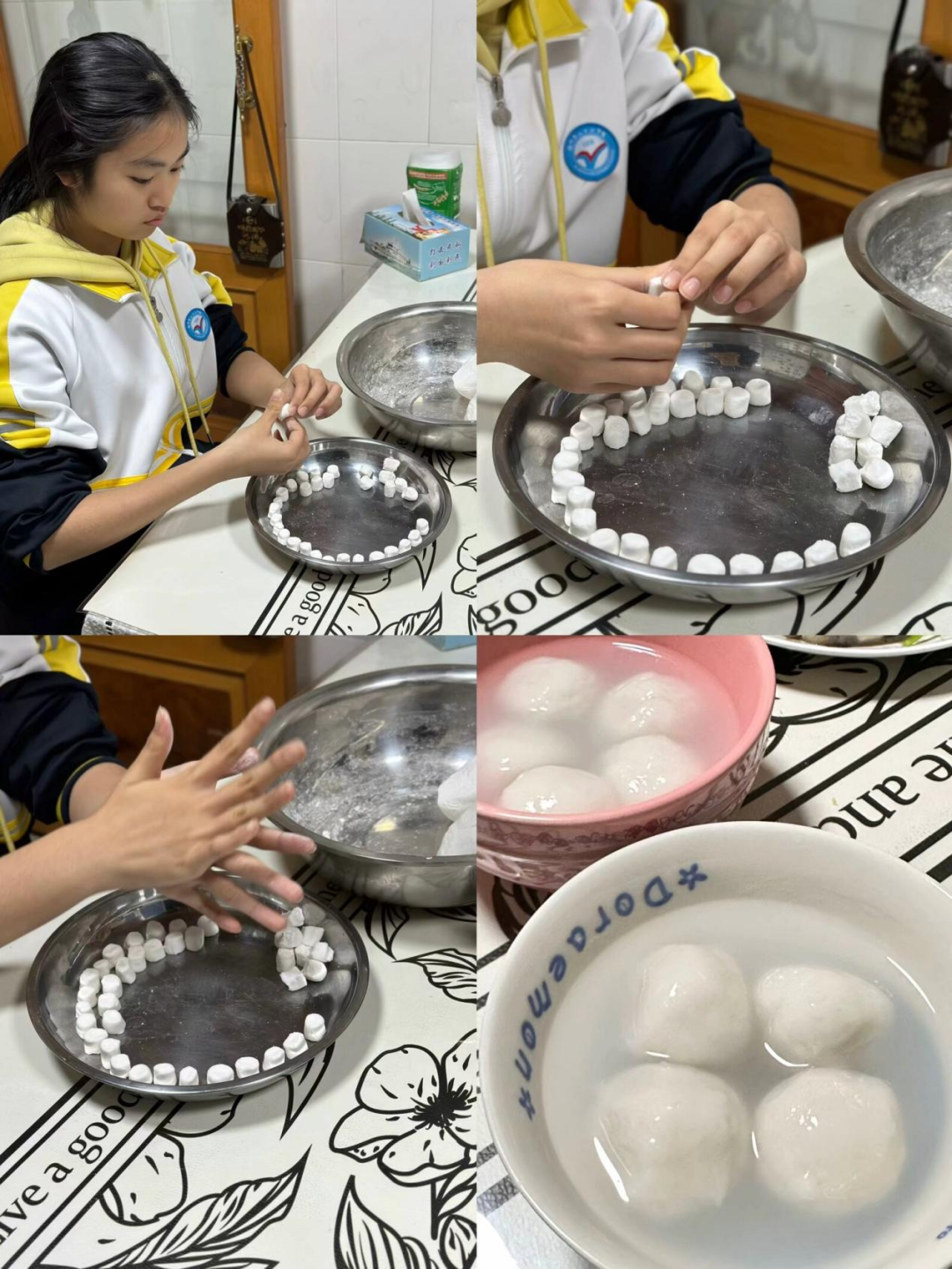 冬至大过年,人间小团圆。吃汤圆是冬至的传统习俗之一,“圆”意味着“团圆”“圆满”。冬至当天,学生与家人围坐在桌前,一家人其乐融融制作汤圆,共享团圆时光,共度美好冬至。