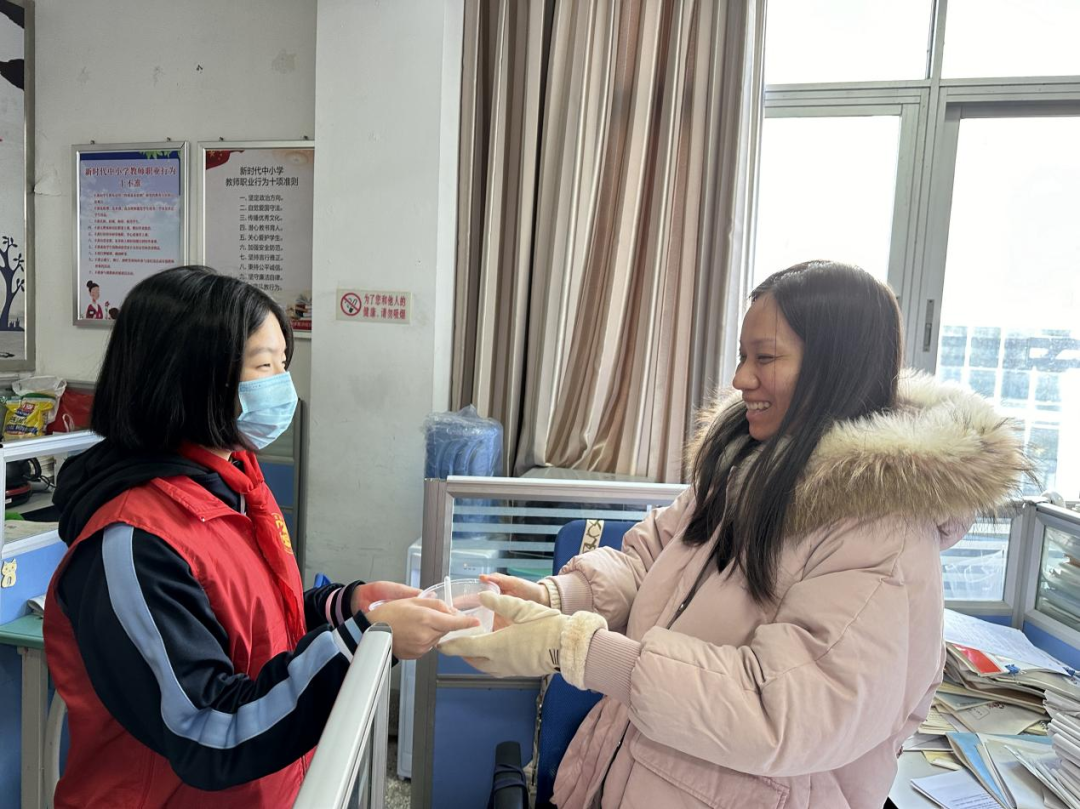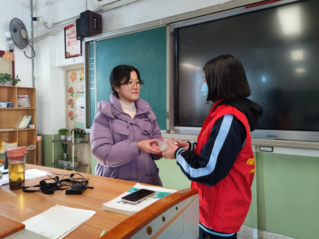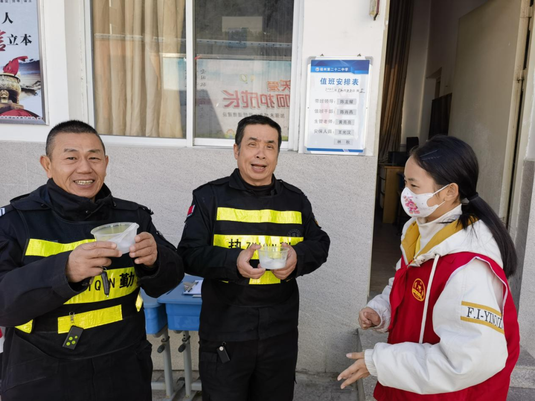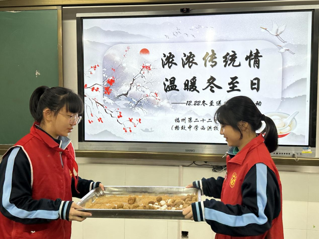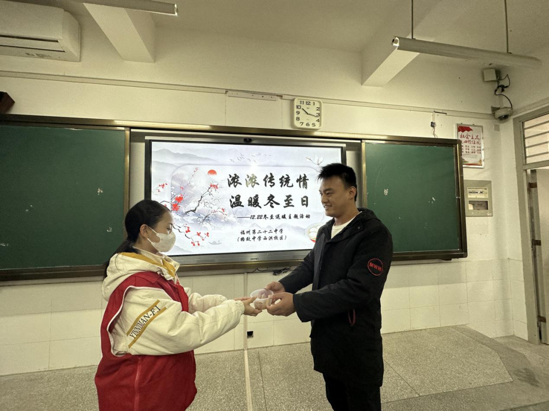 为了让同学们进一步感受冬至的节日气氛,学校团委组织学生开展了“冬至送暖”主题活动,学生志愿者们向辛勤工作的老师们送上汤圆和“米时”(用福州方言称作“拨隆细”,一种将糯米粉搓成丸子在糖粉中来回滚动制成的冬至小吃)。一碗热腾腾的汤圆和“米时”,一声亲切的问候,一句真挚的感谢,表达了同学们对老师、教职工们深深的感激之情。