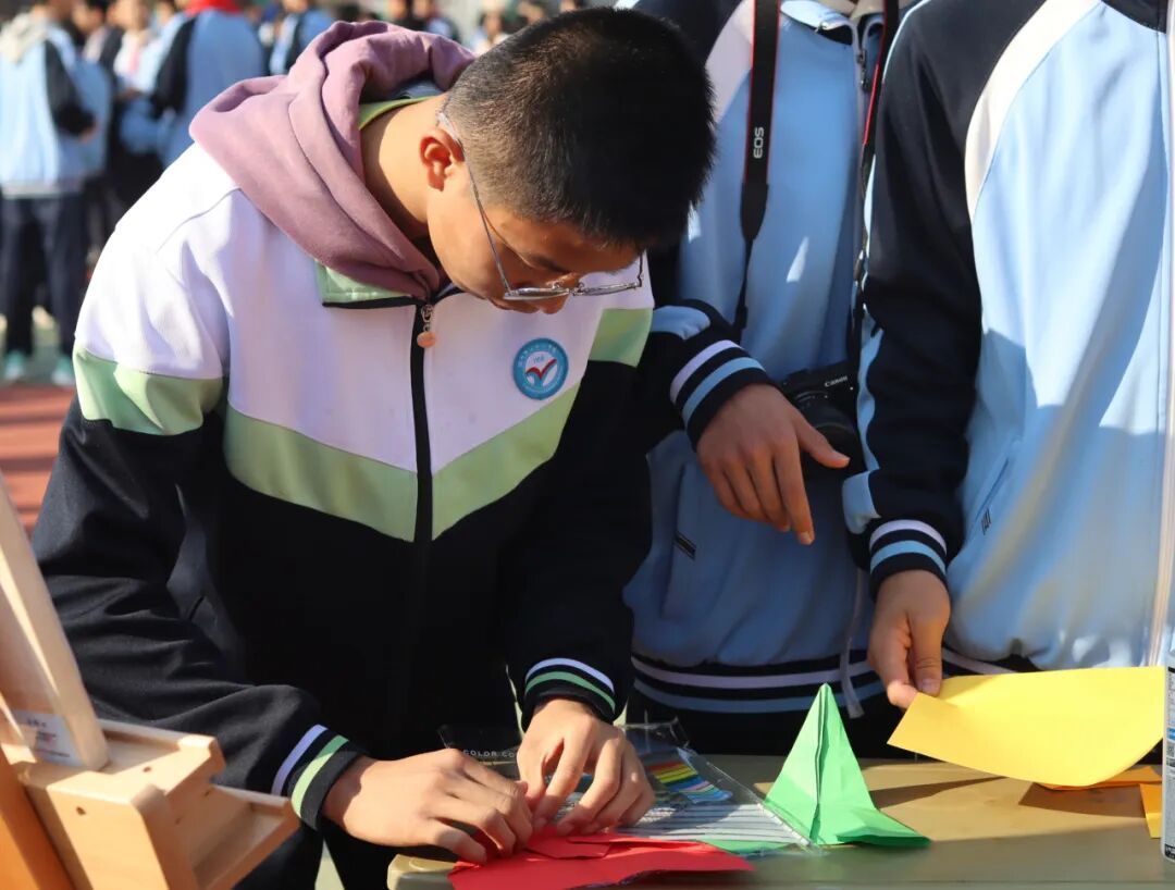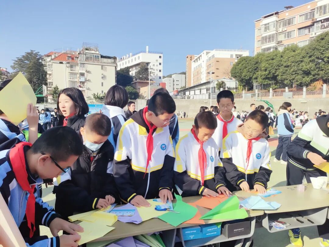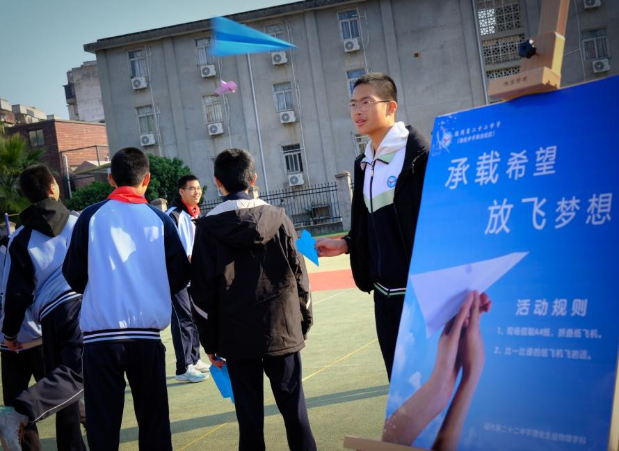 一张薄薄的彩纸,经过数次翻折变成一架精巧的飞机,轻轻一挥,纸飞机就乘风而去,同学们绞尽脑汁,怎么让小小飞机飞得更远呢?原来这里是物理学科开展的主题为“承载希望,放飞梦想”的纸飞机制作与投掷活动现场。同学们通过互相讨论,动手操作,总结出很多种方法让纸飞机飞得更远,比如:要尽量折得两边对称,翅膀和机身比例要恰当,注意前后的平衡,如何投掷......小小的纸飞机承载着同学们的欢声笑语,飞翔在蓝天上,让同学们在实践中收获自信,在自信中锐意进取。