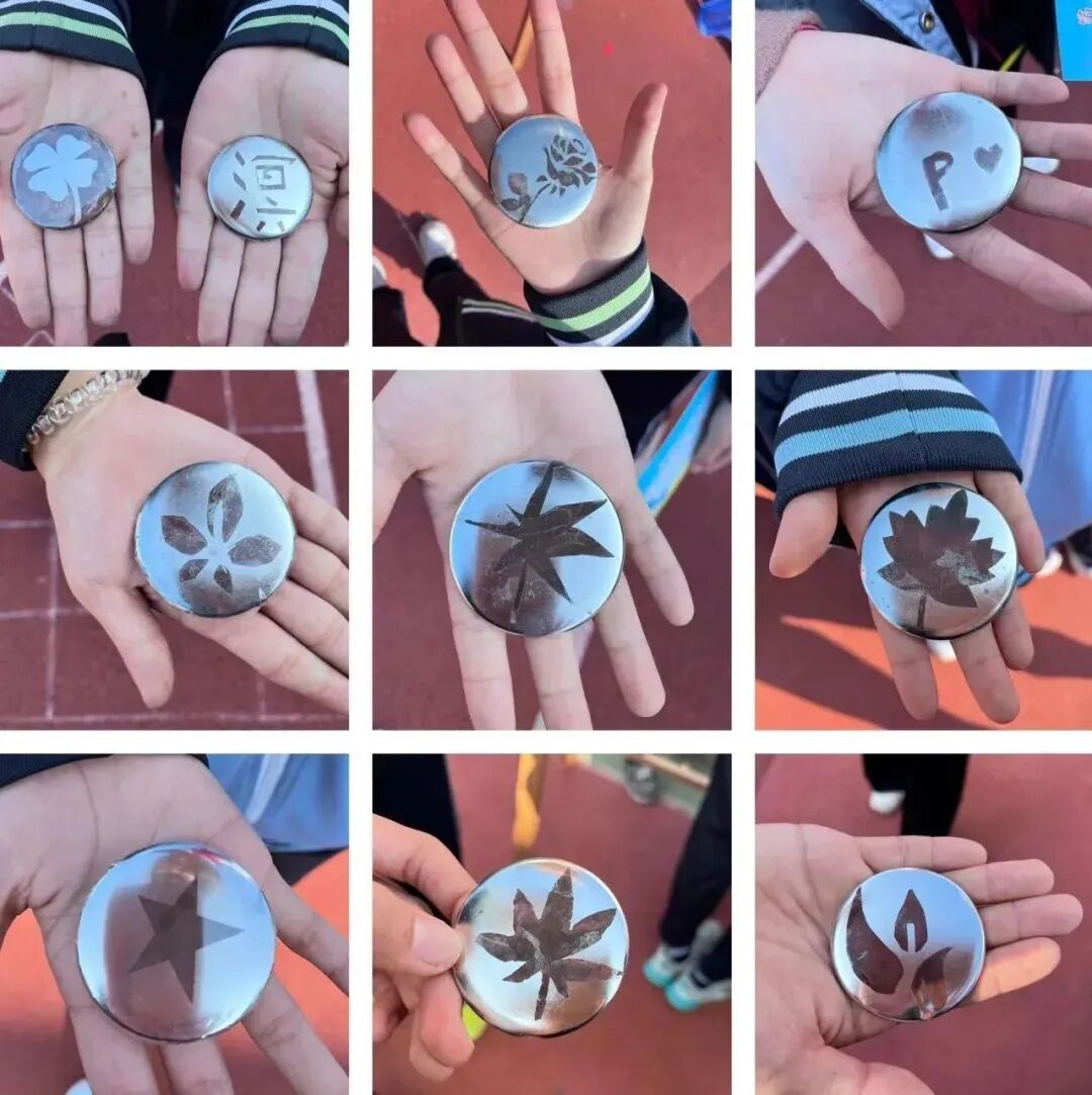 奥运火炬上的祥云图案是如何制作的?各种金属铭牌、金属工艺品的图案是如何绘制上去的?为了让同学们感受化学与工艺、与美术结合之美,感受金属蚀刻技术在生活中的应用,化学学科开展了“金属蚀刻画”——自制徽章活动。活动现场,同学们充分发挥创意,在他们的奇思妙想和精巧设计下,原本单调的金属徽章逐渐呈现各式各样的图案,或是花朵、或是汉字、或是动物、或是星星... ..在徽章上绽放,精彩纷呈。同学们认真投入,时不时还相互交流创意,小小徽章倾注着同学们对科学的热爱,整场活动同学们发现美、创造美、展示美,同学们拿着自己自制的徽章相互分享,脸上洋溢幸福自信的笑容。