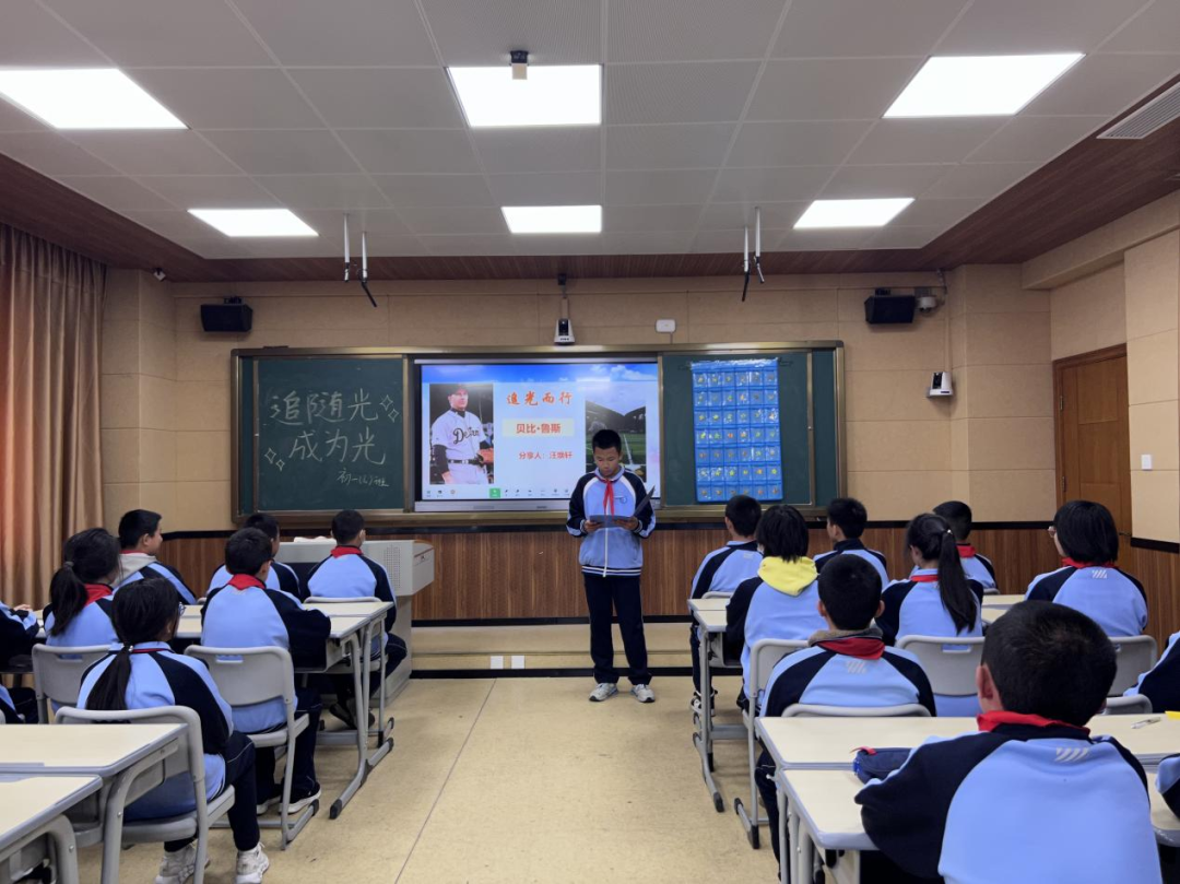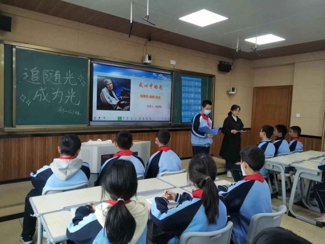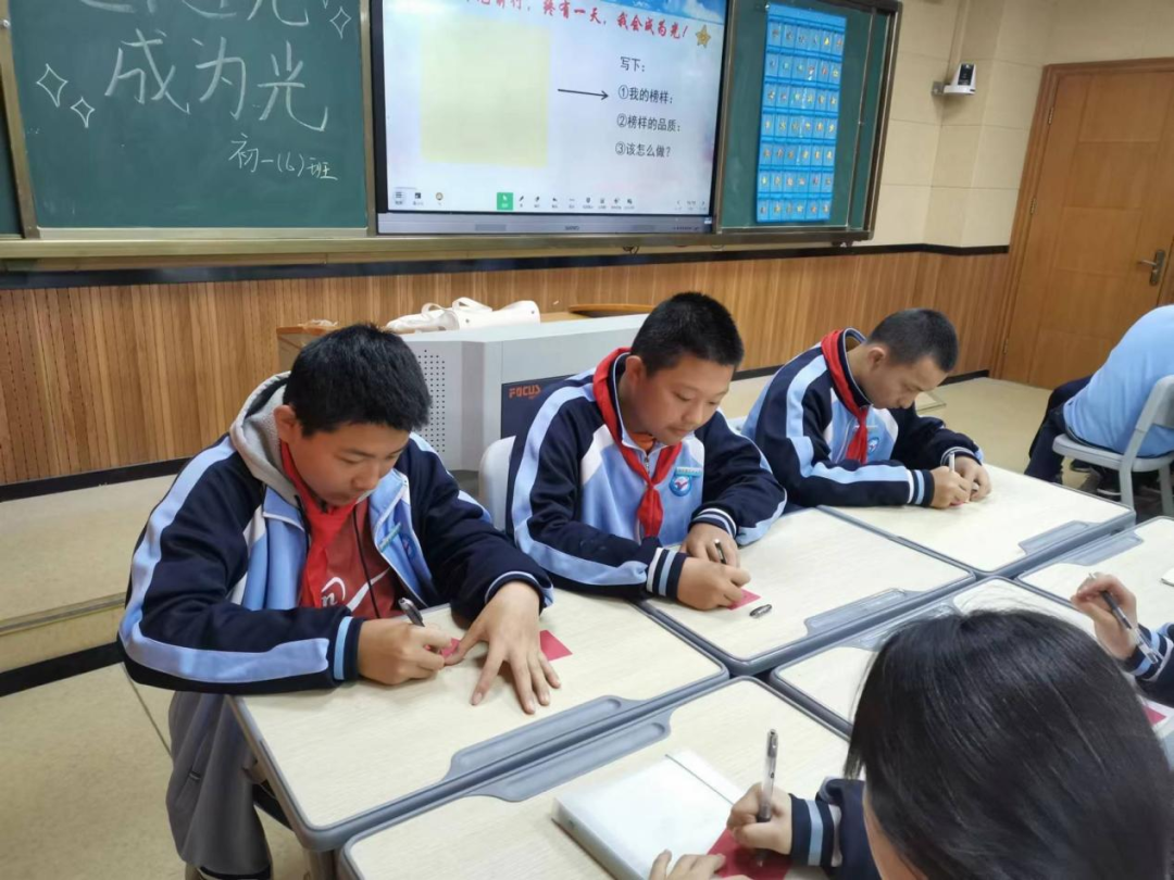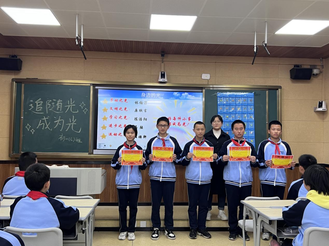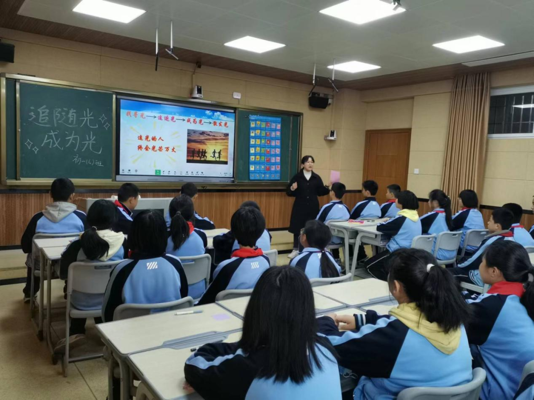 初一(6)班班主任郑治欢老师以“追逐光,成为光”为主题上了一节精彩纷呈的班会课。治欢老师通过问题引入,引发学生的思考,活动内容贴近学生生活,针对学生容易从众、有投射心理,渴望独当一面又缺乏独立人格、渴望与成人对话的心理,特别是让学生从身边的同学着眼,发现身边的榜样。