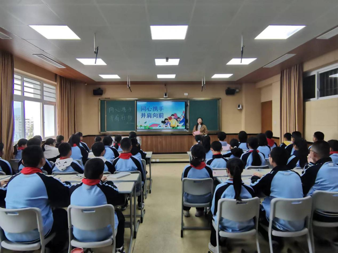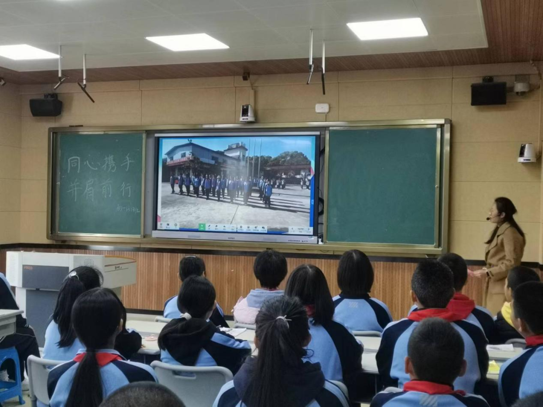 念老师以《同心携手,并肩前行》为主题,开展团结教育。整体环节有序丰富,逻辑性较好,在语言表达上很合适,细节设计部分可以再注意一点:1、游戏的设置,要面向班级学生,游戏的成功率不是很高,因此花费了较多时间。2、合唱部分,不是很整齐,最好需要提前训练一下。3、开头学生表演的时候可以让学生带点工具表演。也是我们在开课时应该要注意的,也是共同学习成长了。