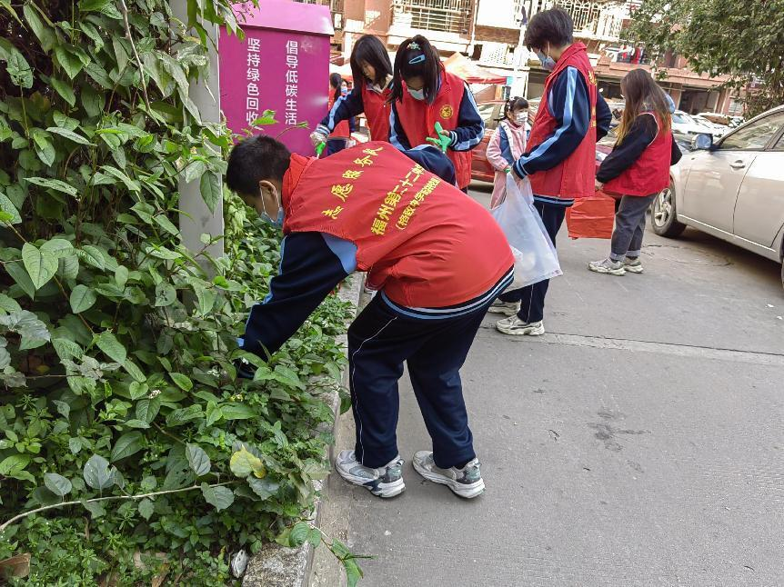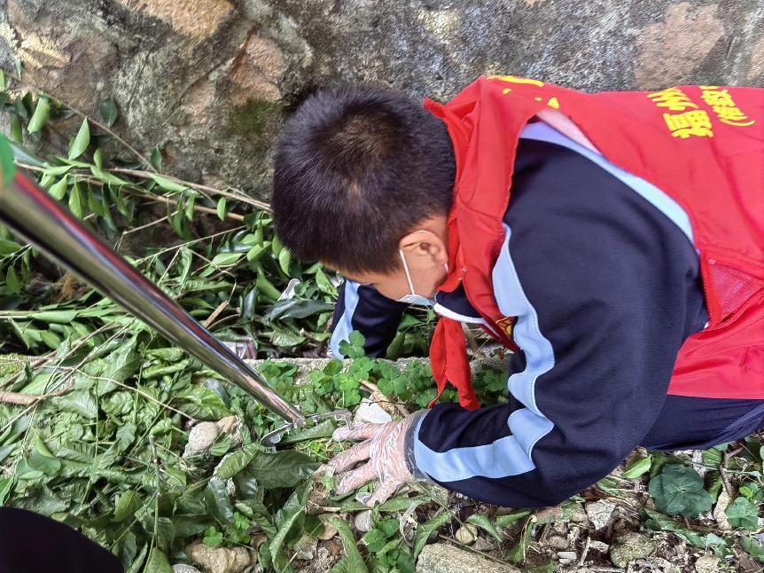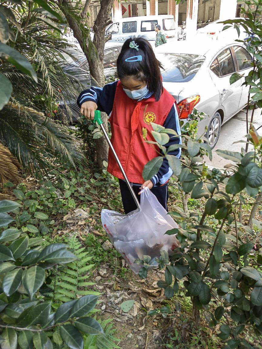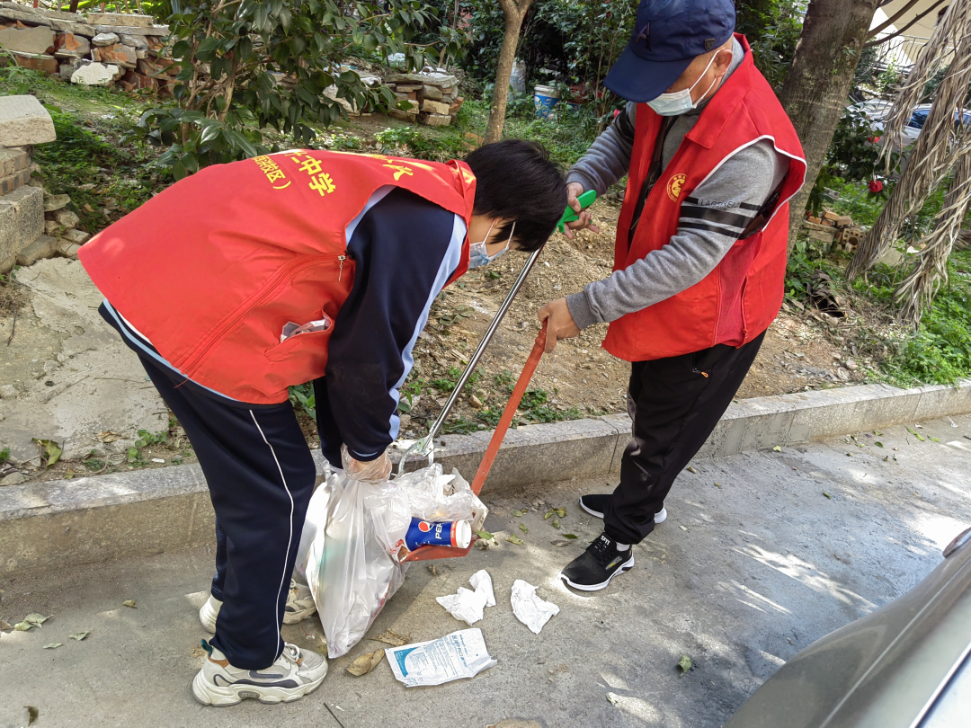 在社区工作人员的带领下,每位身为志愿者的同学,都积极地在梁厝新村开展清洁卫生活动。他们戴着手套、拿着垃圾袋和夹子,对周边的垃圾进行彻底清理。道路旁、树丛里、水沟边,他们的身影随处可见。他们不嫌脏不嫌累,一丝不苟地做着清洁工作。
