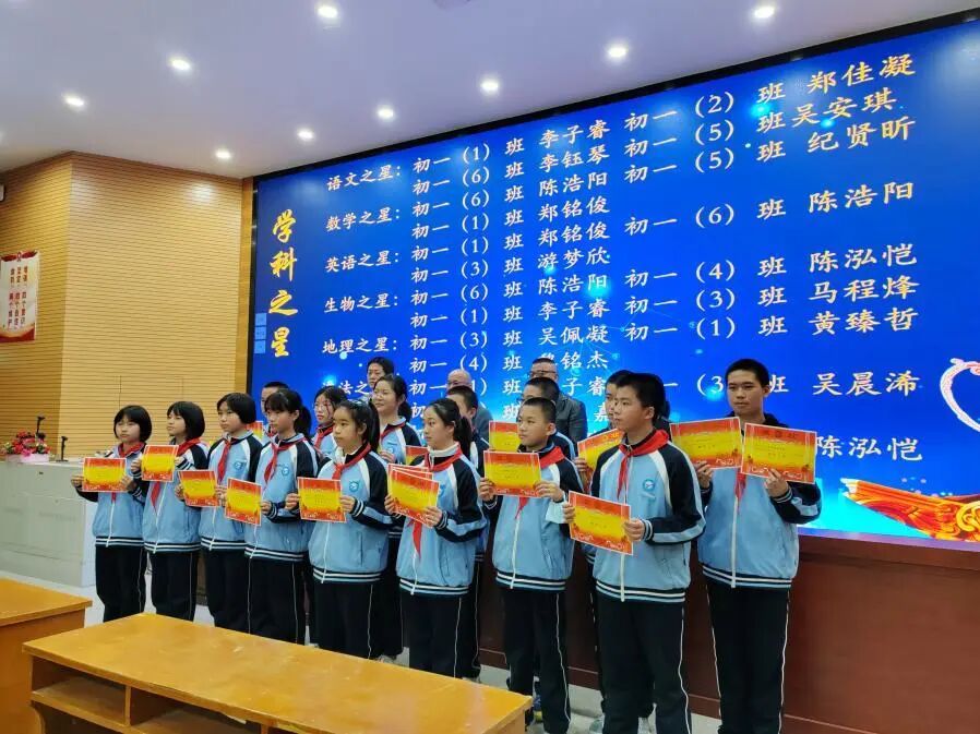 陈龙耀校长宣读了获奖名单,在全场雷鸣般的掌声中,获表彰的同学依次上台领奖,并与颁奖老师合影。本次大会表彰了初一年段“全科优秀学习奖”、“学习之星”、“进步之星”、“学科之星”“德育之星”、“文明礼仪之星”“劳动之星”“优秀班级”和“进步班级”。一拨又一拨的同学上台接受颁奖,一轮又一轮的掌声响起,鼓舞着每一位学子奋勇前进。