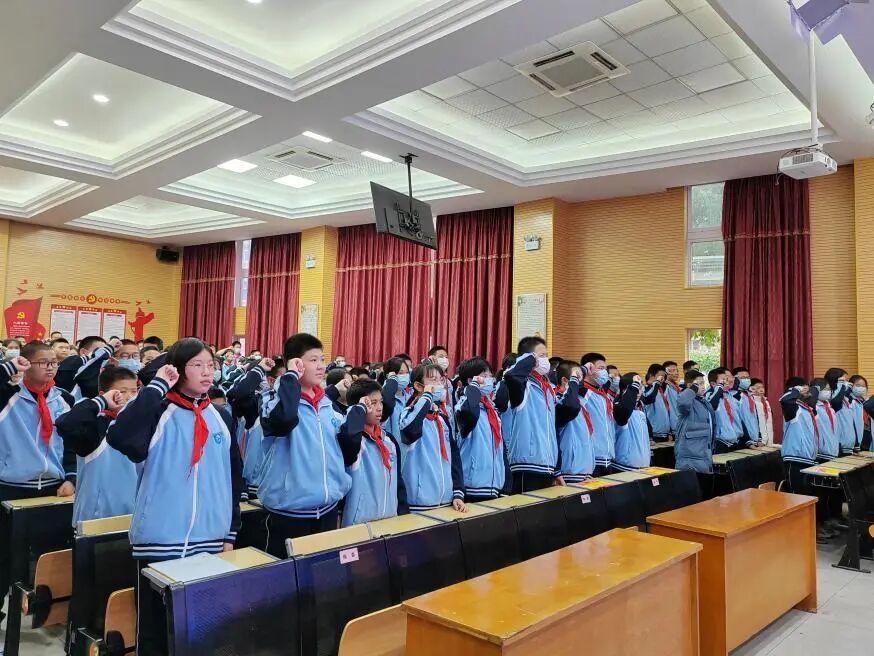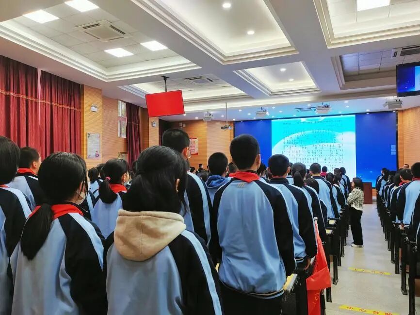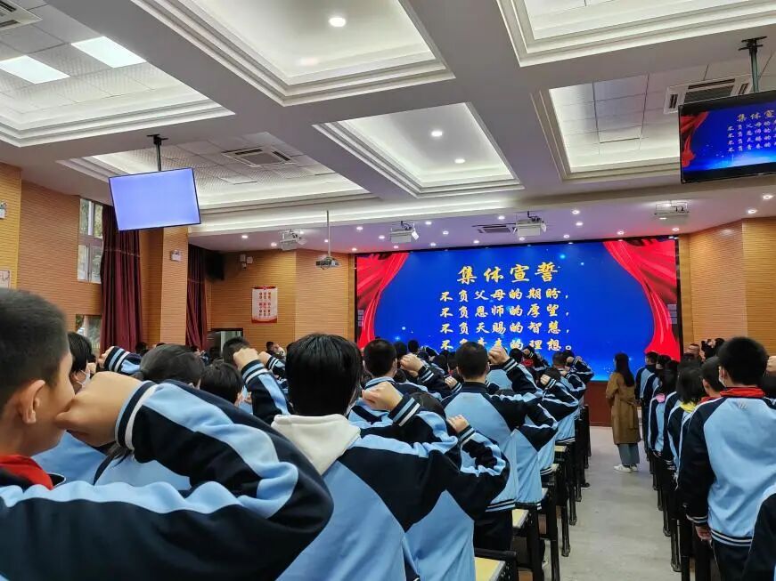 会议进入尾声,在初一(6)班陈浩阳的带领下,全体初一学生庄严宣誓: