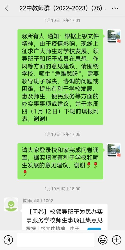2023年1月10日,由于疫情影响,学校线上征集全体教职工对学校发展、领导班子和班子成员在思想、作风等方面的意见建议。广大教职工围绕学校、师生“急难愁盼”,需要领导班子解决、协调的问题或困难,提出有利于学校发展、惠及师生、便民服务等方面的办实事事项或建议。