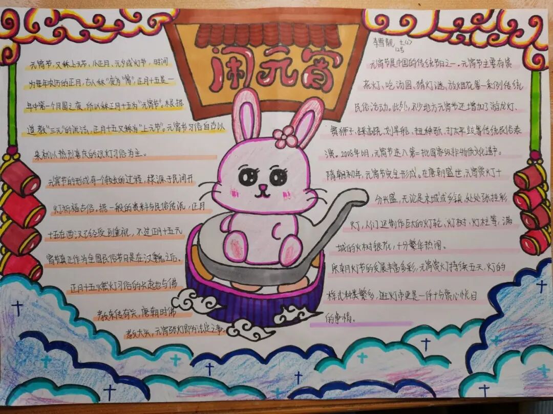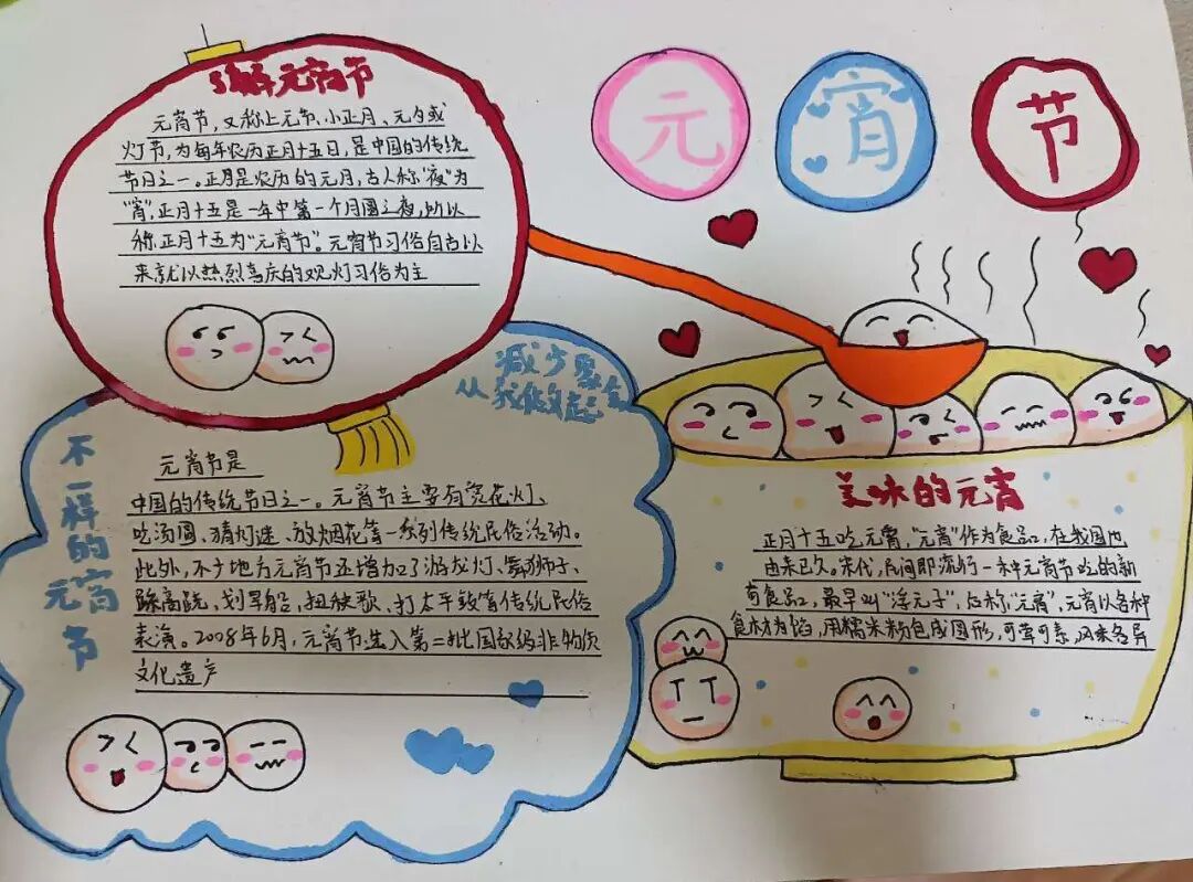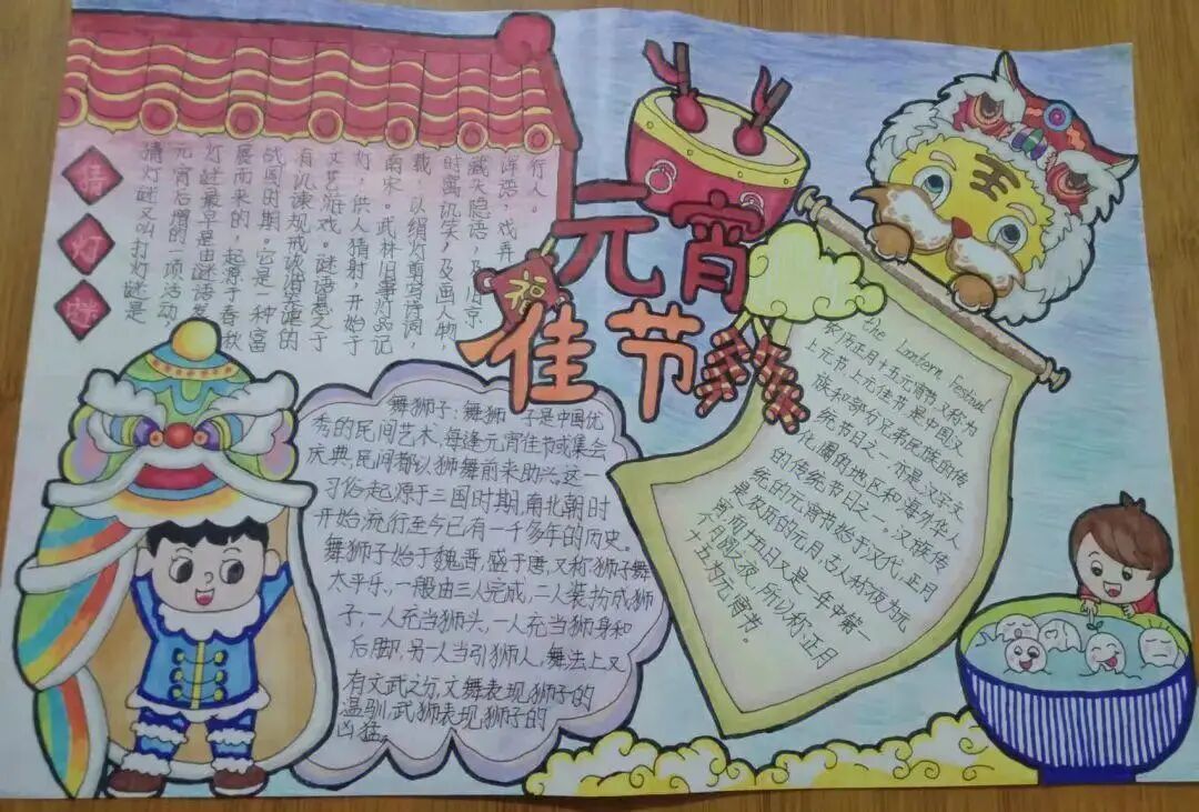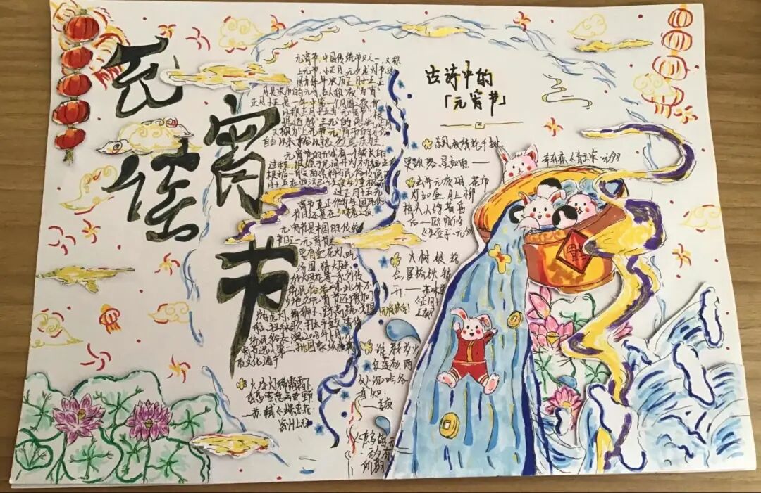 学生通过收集元宵节的由来、风俗习惯、文化活动等内容,精心设计了一幅幅图文并茂、多彩生动的手抄报。