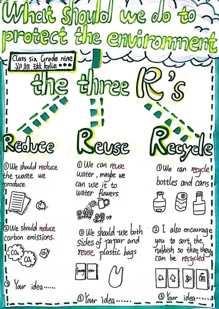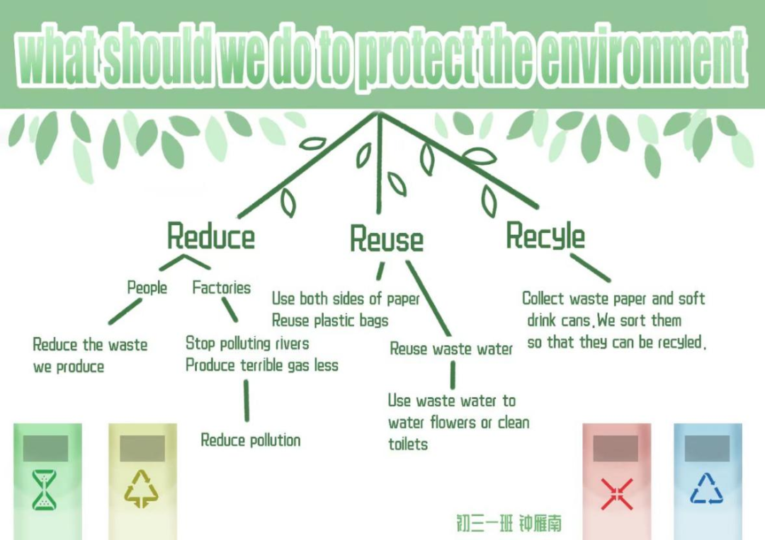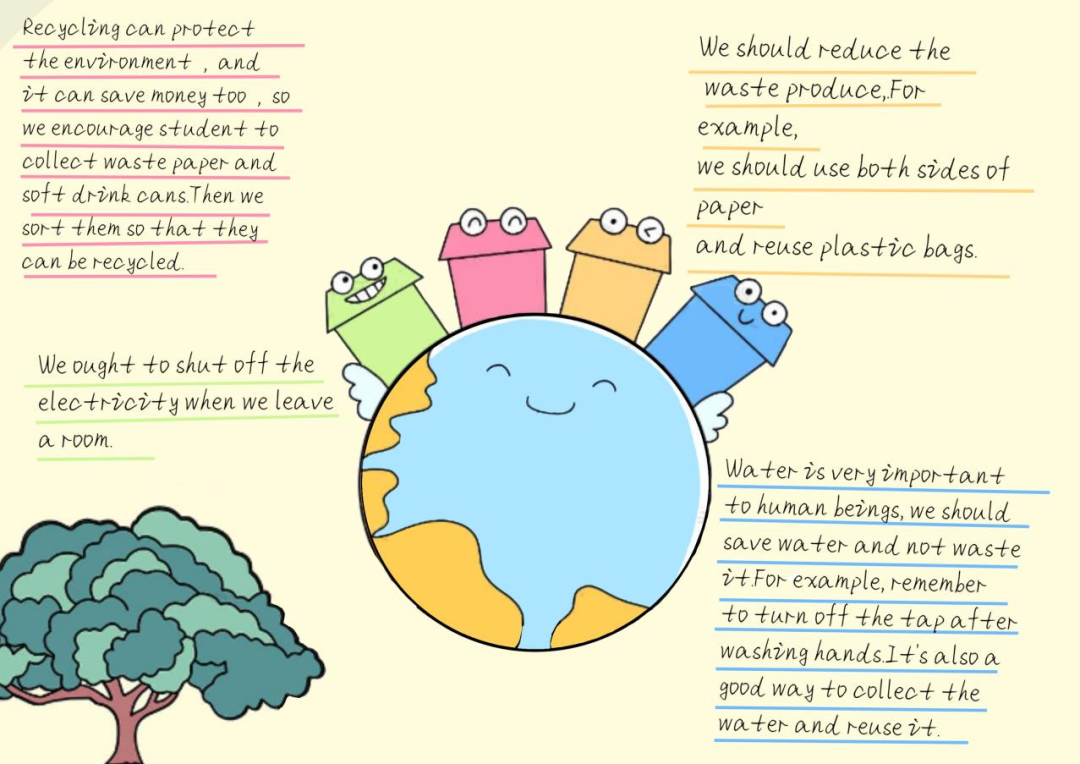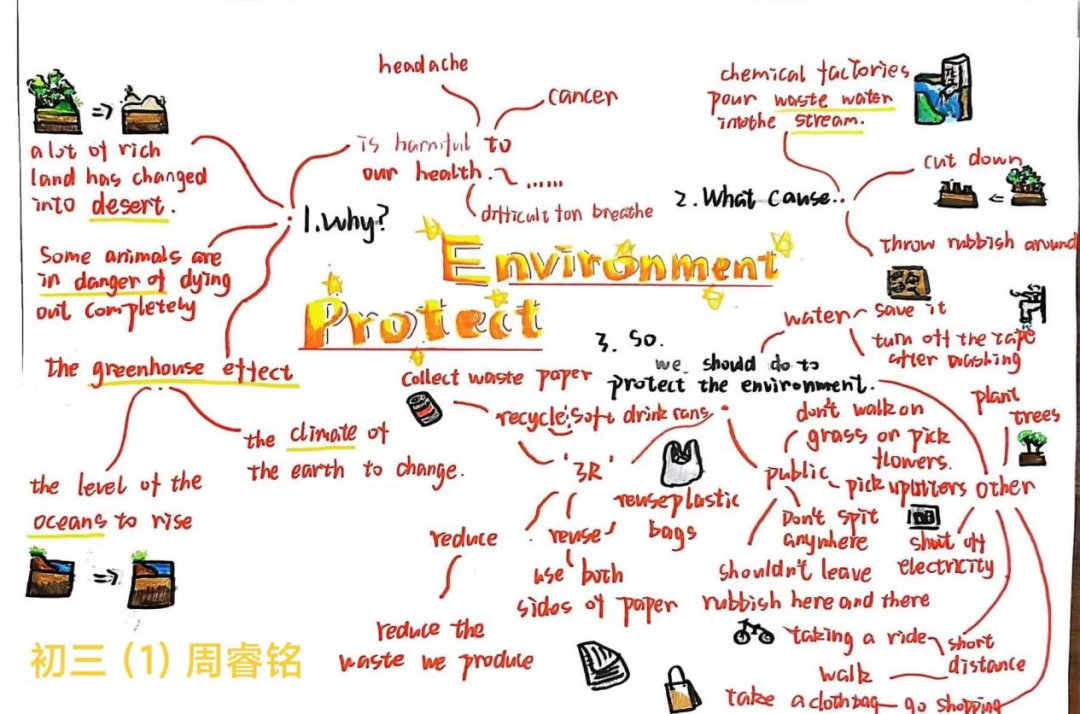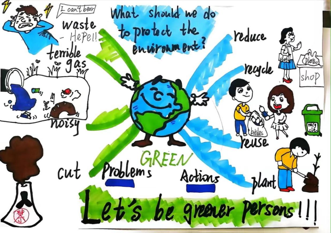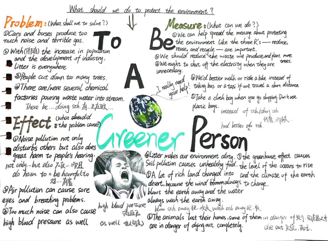 环保是永恒的德育主题。在学习完课文Saving the Earth后,学生们深有感触,九年级英语集备组布置学生完成课文的思维导图设计。学生灵活运用思维导图,提取文本关键信息,挖掘文章主题意义,积累必备词汇,把握主要句型,掌握知识要点,学会分析、推理和概括,通过富有逻辑性的知识整理,训练学生思维能力,获得知识与思维方面的共同进步,奠定核心素养形成的良好基础。同时增强学生的环保意识,引导学生学以致用,人人争当生活中的环保卫士。