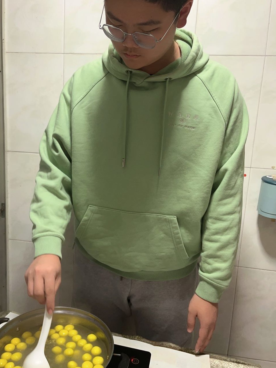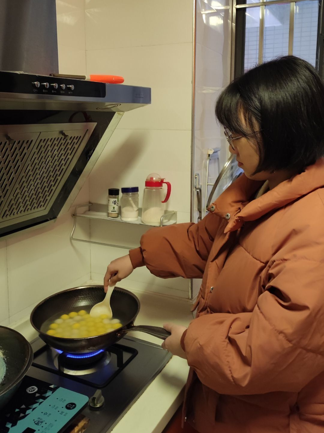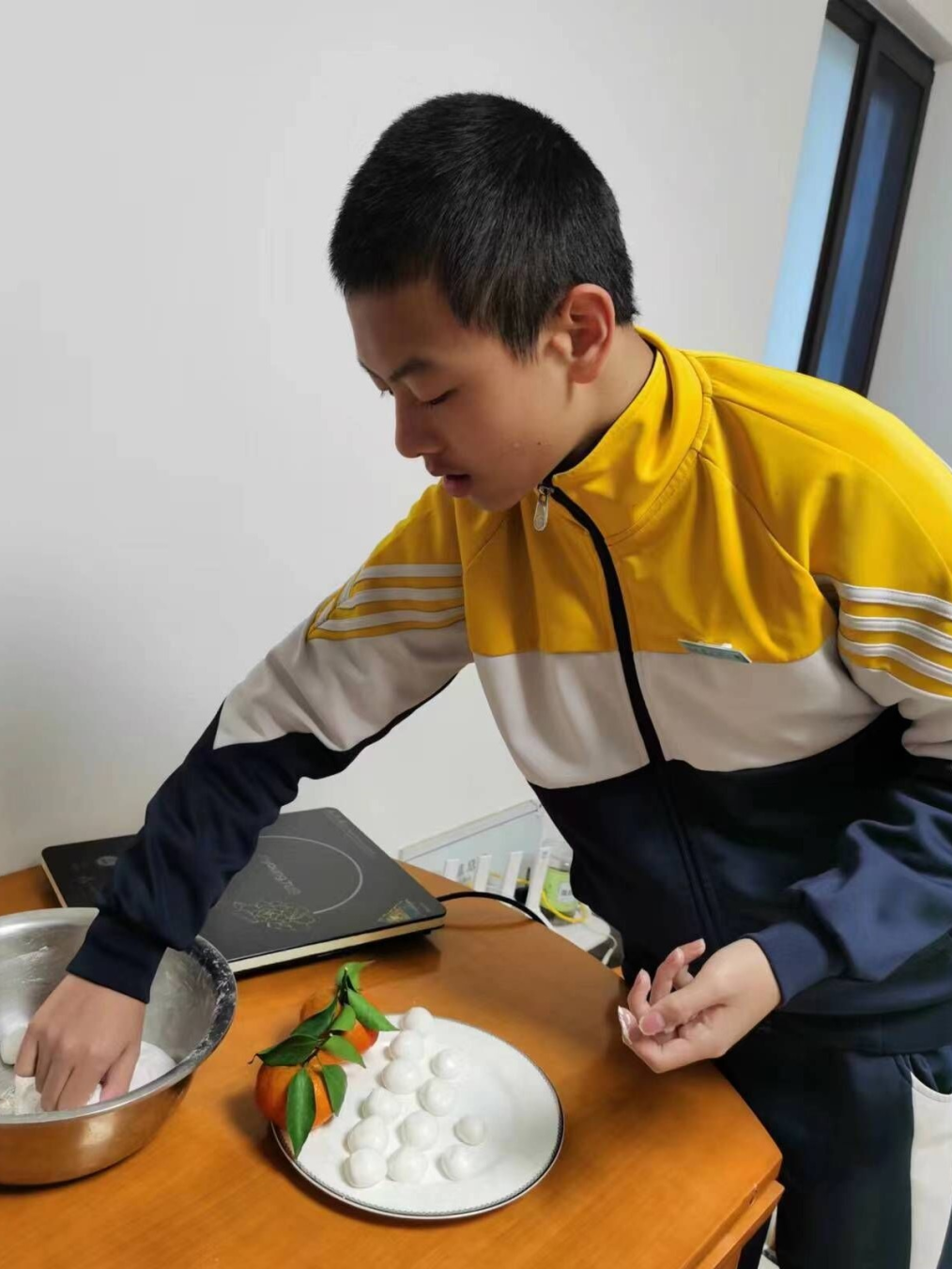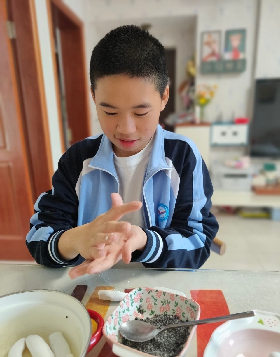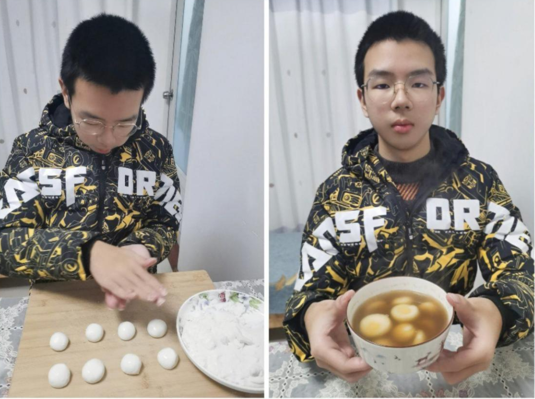 在冬至这一天,一般有“北方吃饺子,南方吃汤圆”的习俗,在福州还会吃一种叫“米时”的小吃(用福州方言称作“拨隆细”,一种将糯米粉搓成丸子在糖粉中来回滚动制成的冬至小吃)。同学们在家中大展身手,在家长的指导下,自己动手做起了小吃。